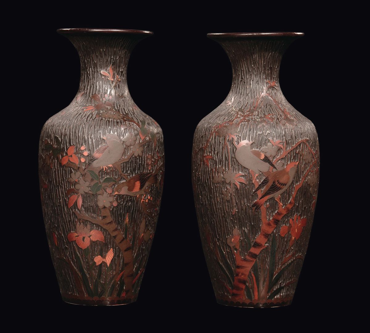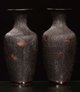 A pair of carved wood vases with branches and birds, Japan, Meji, late 19th century