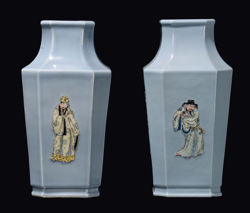 A pair of Claire de Lune porcelain vases with figures, China, Qing Dynasty, Daoguang Period (1821-1850)