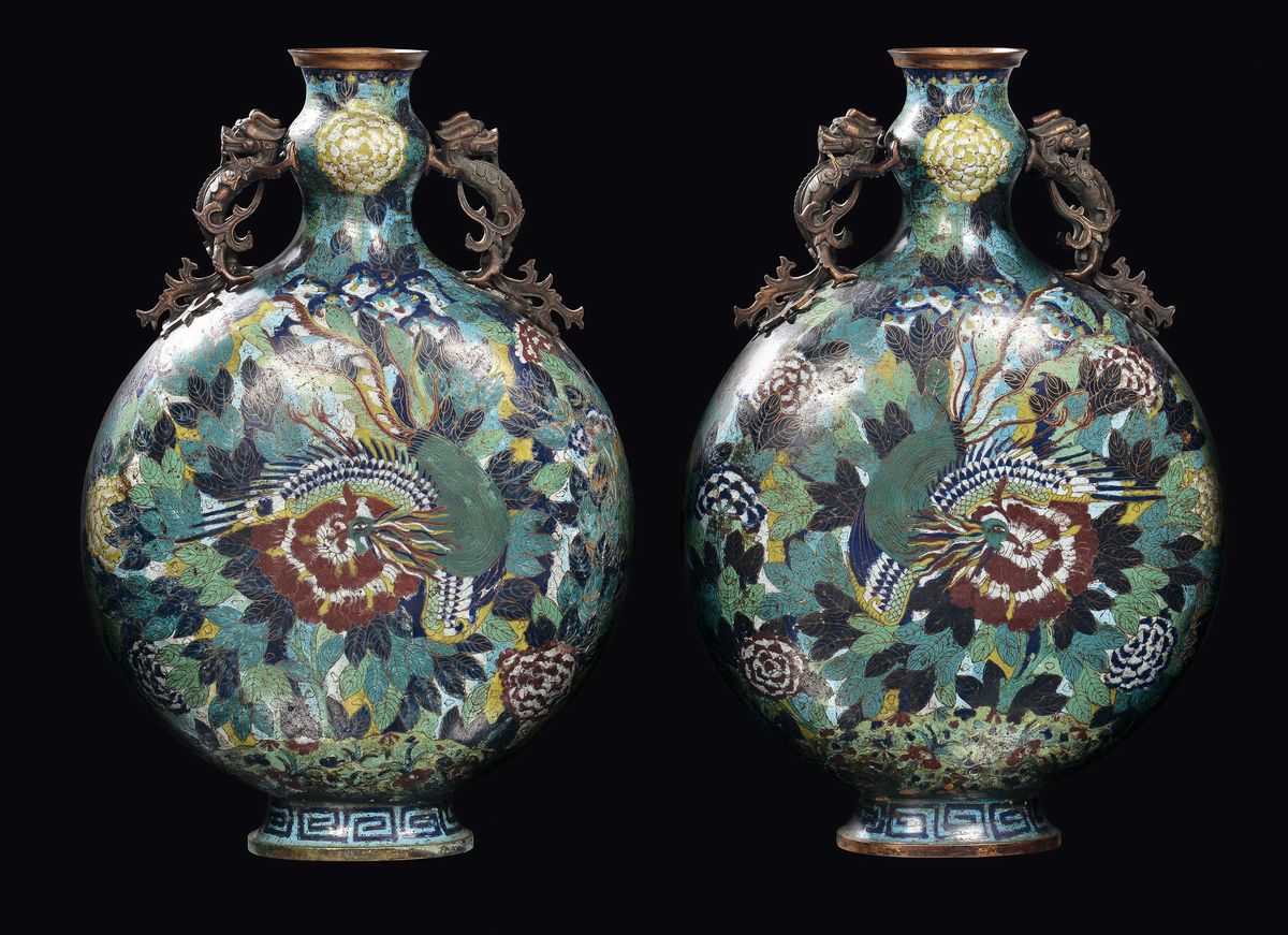 A pair of large cloisonnè flasks with phoenixes, China, Qing Dynasty, 19th century