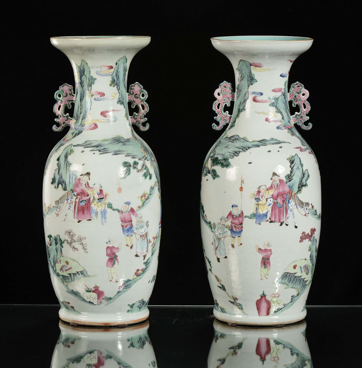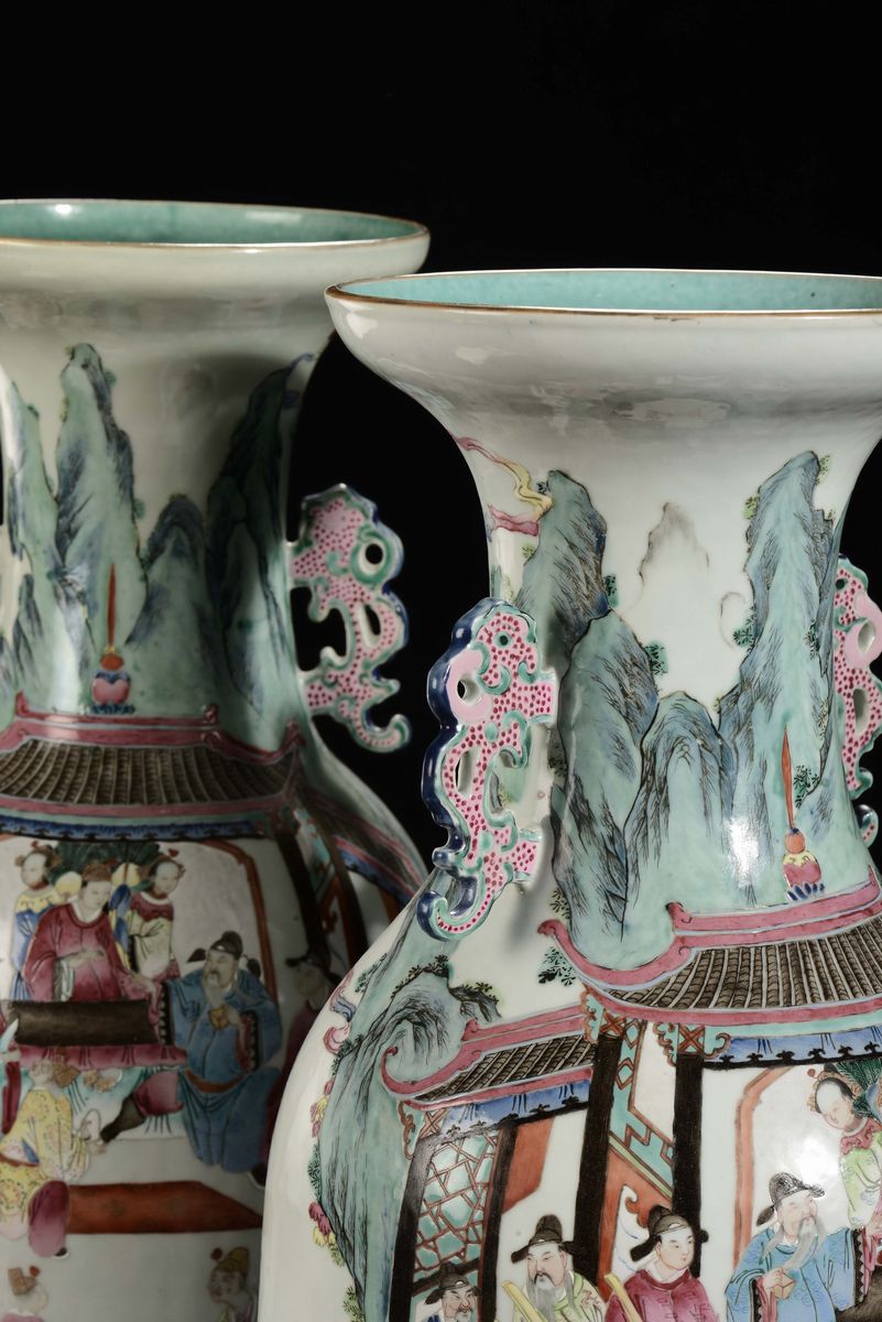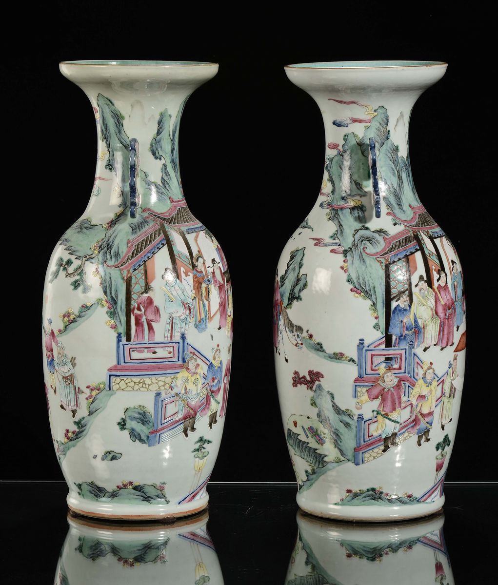 A pair of polychrome Famille-Rose porcelain vases with oriental scenes decorations, China, Qing Dynasty, late 19th centur [..]