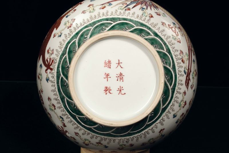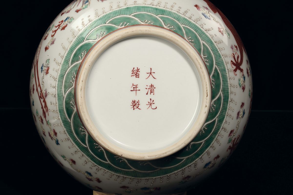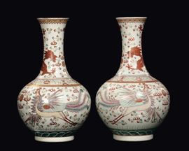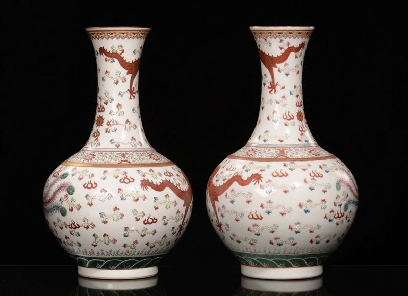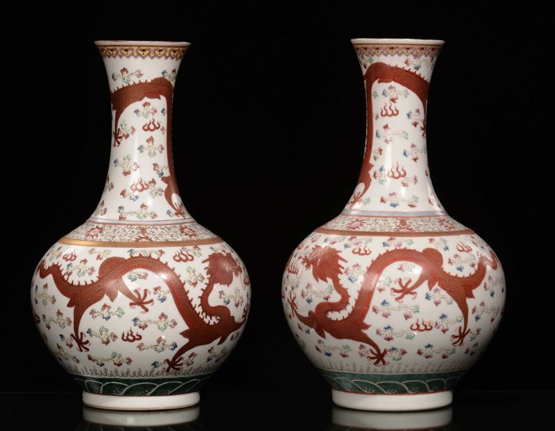 A pair of polychrome porcelain bottle vases with red dragons, China, Guangxu mark and of the period (1875-1908)