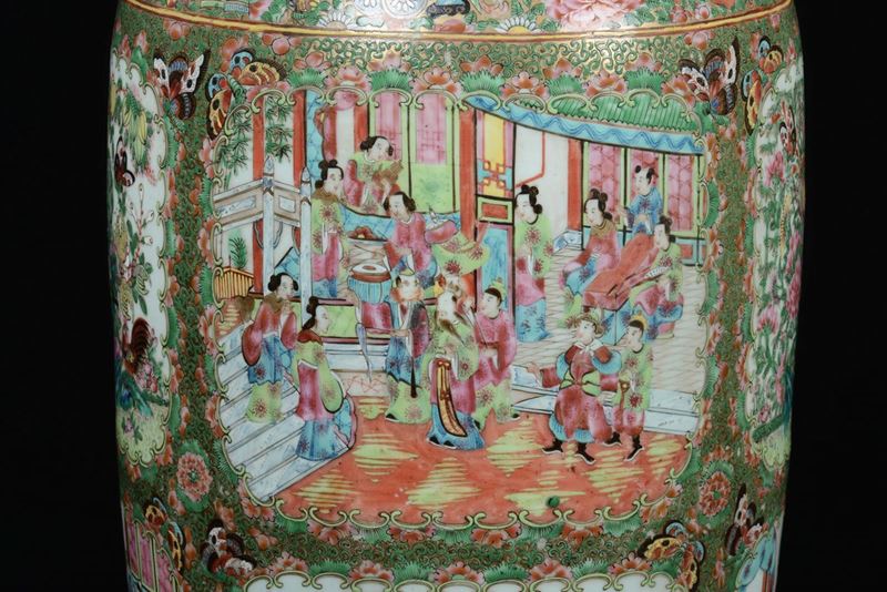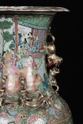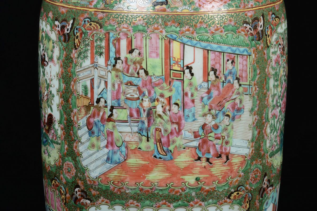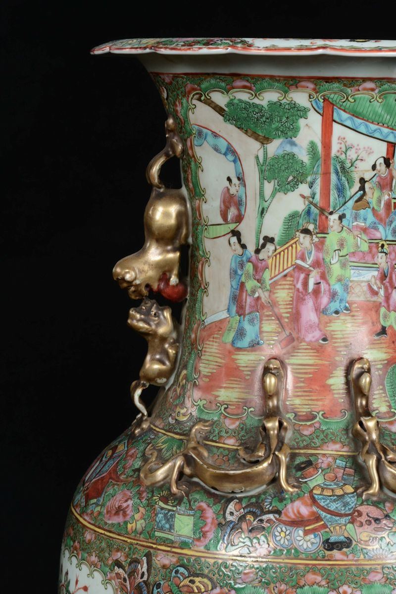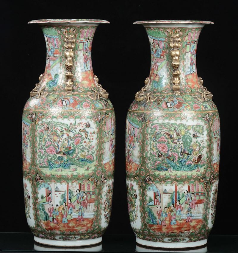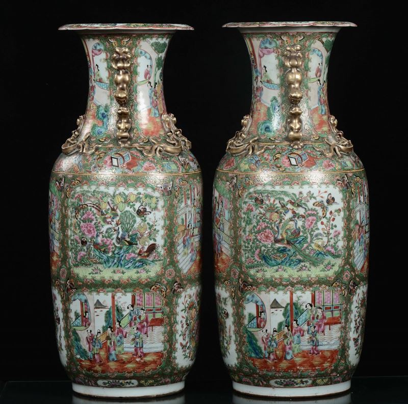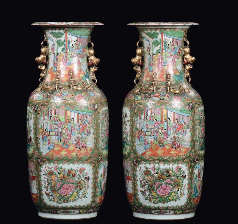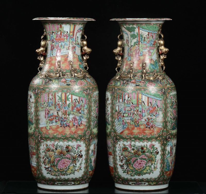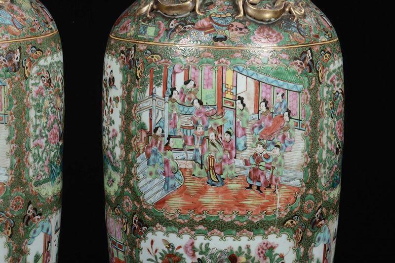A pair of polychrome porcelain Canton vases with court life scenes, China, Qing Dynasty, 19th century