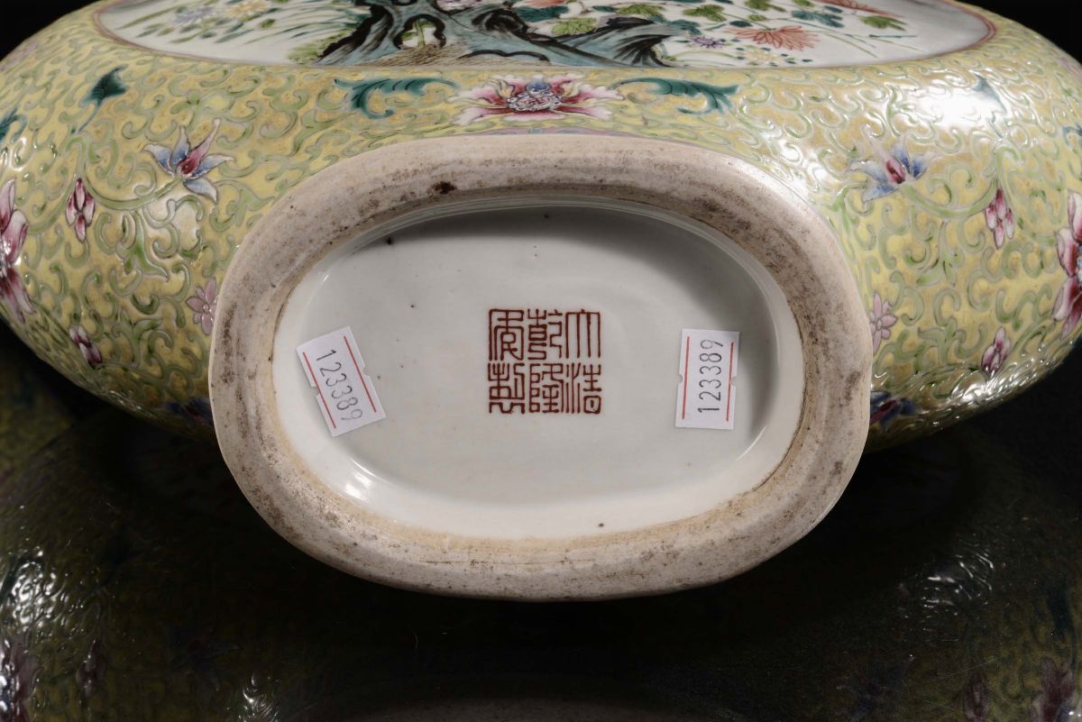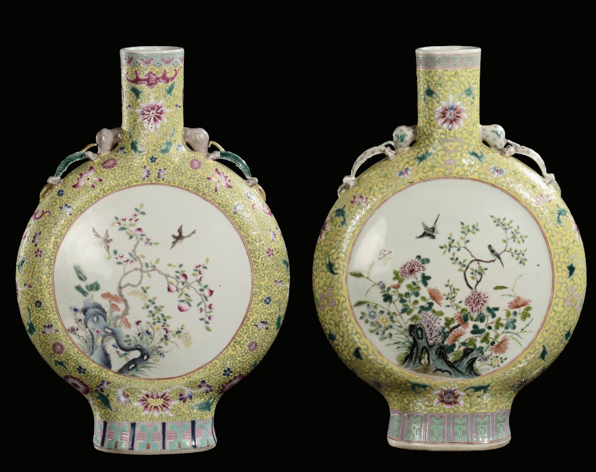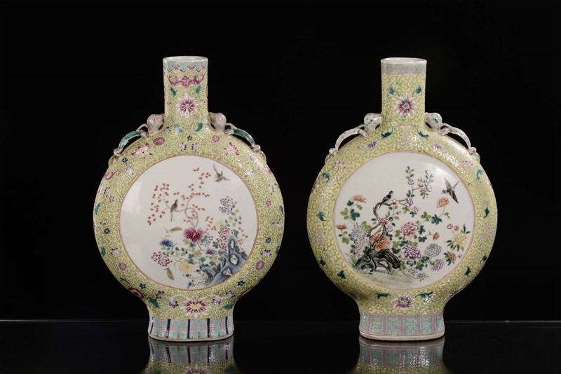A pair of porcelain flasks yellow-ground with naturalistic scenes within reserves, China, Qing Dynasty, 19th century