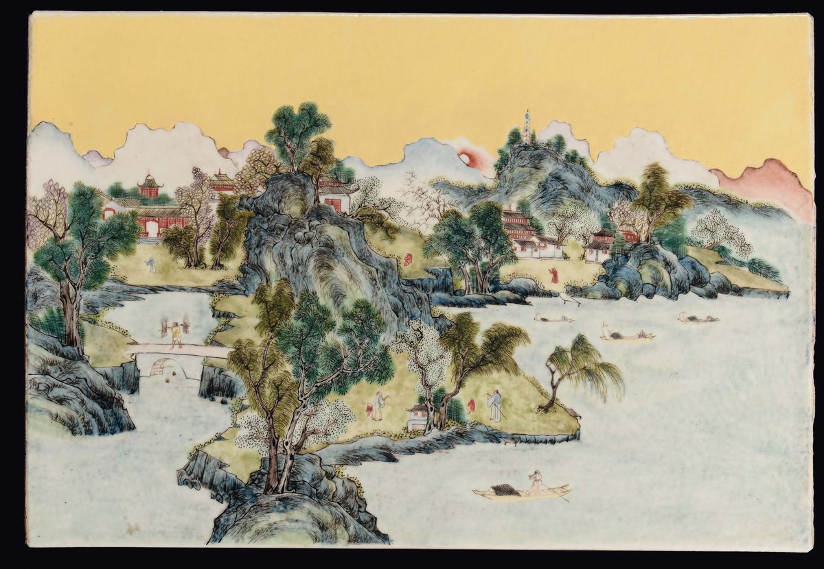 A pair of porcelain plaques yellow-ground depicting a landscape with villages, China, Qing Dynasty, 19th century