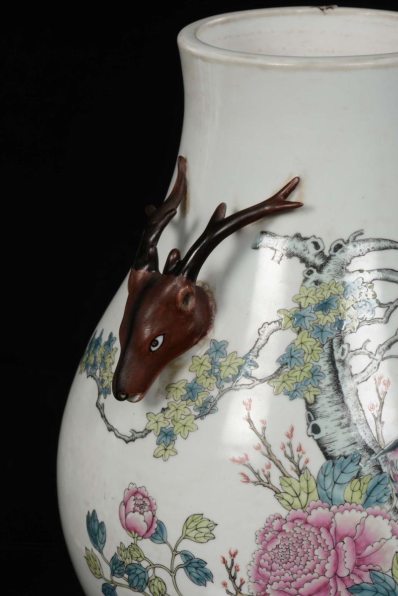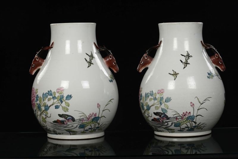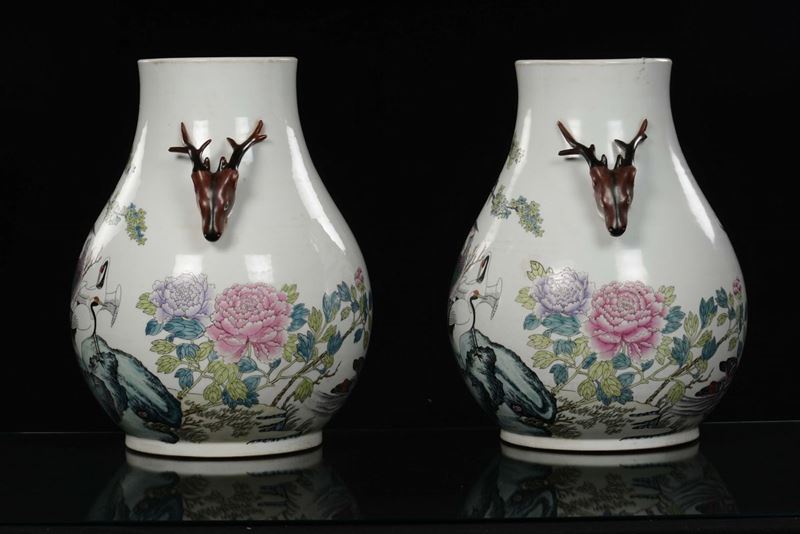 A pair of porcelain vases with naturalistic decorations and “deer heads” handles, China, Republic, 20th century