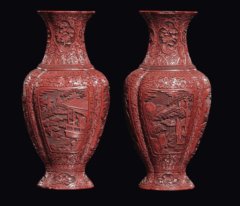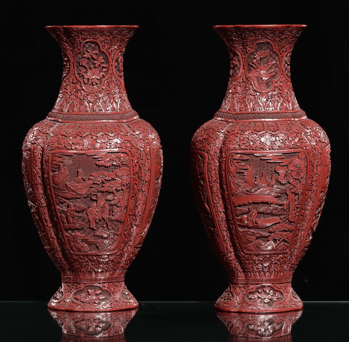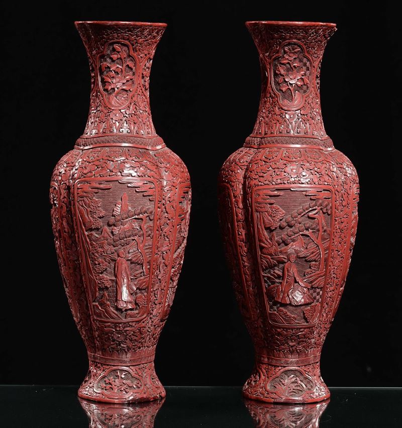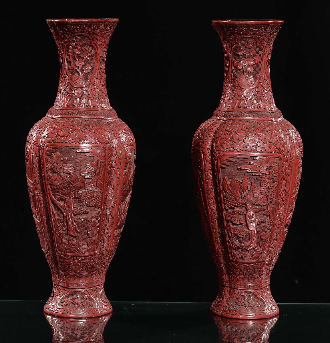 A pair of red carved lacquer vases with landscapes and everyday life scenes within reserves, China, Qing Dynasty, early [..]