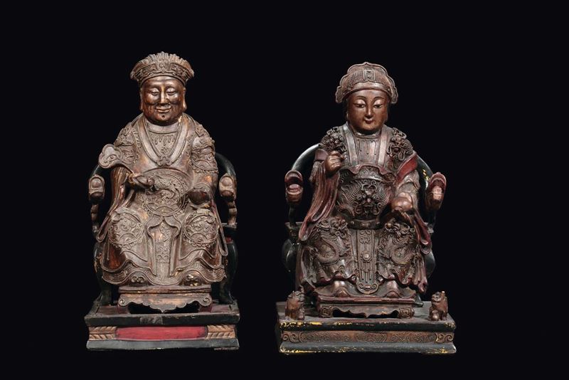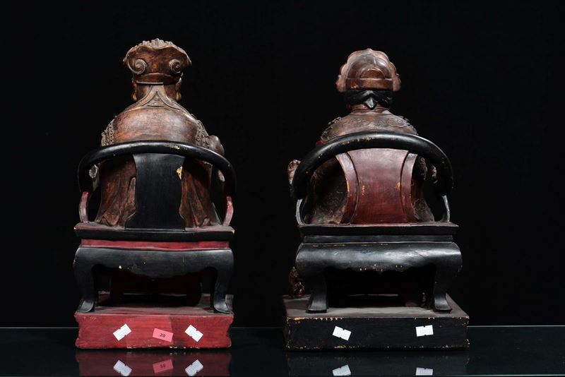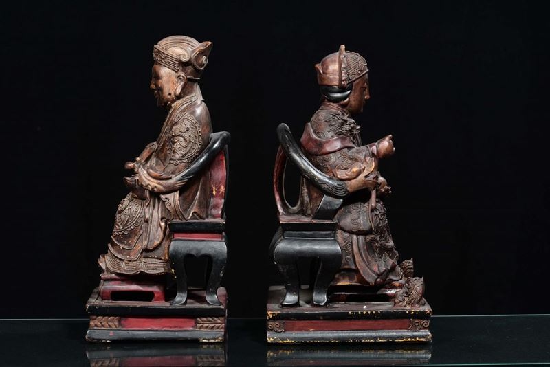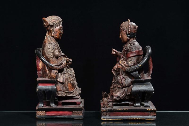 A pair of wood emperors on throne, China, Ming Dynasty, 17th century