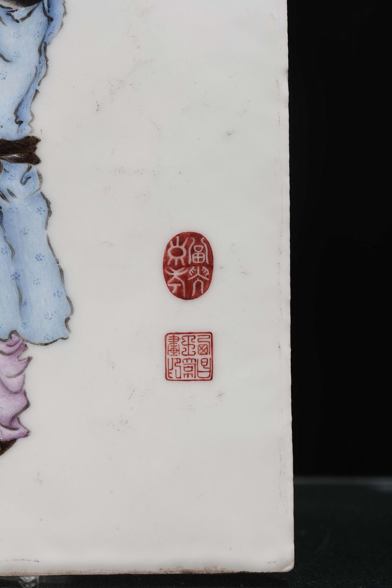A polychrome porcelain “oriental figures and inscriptions” platque, China, Republic, 20th century