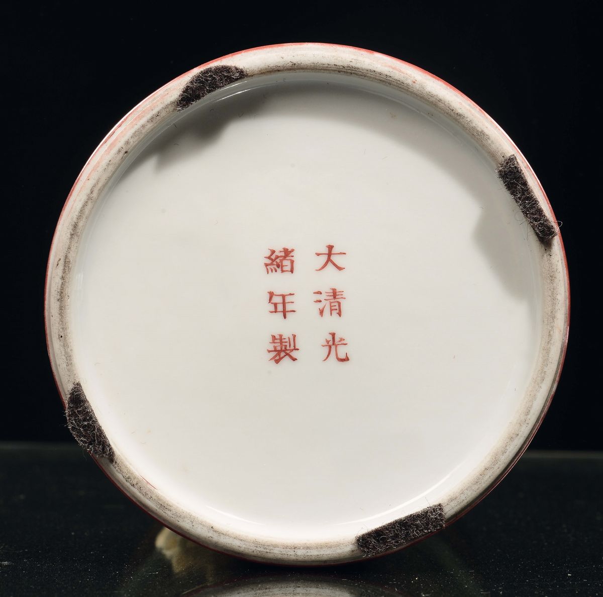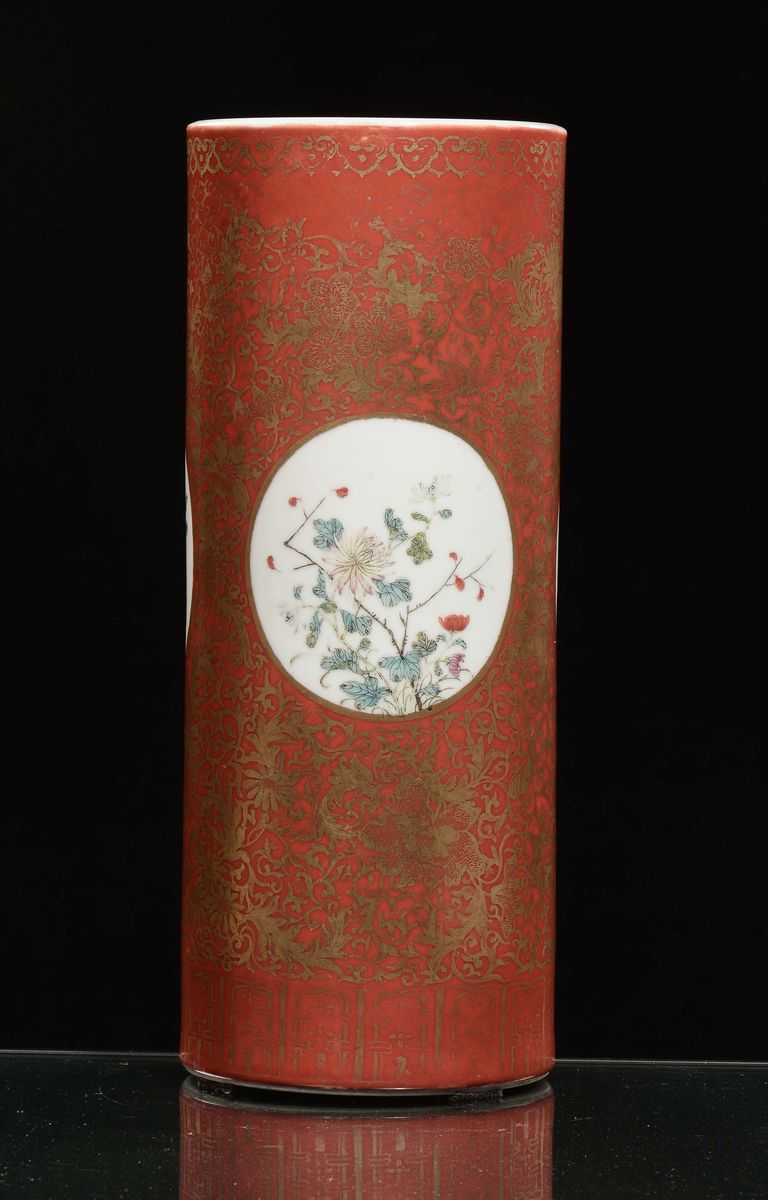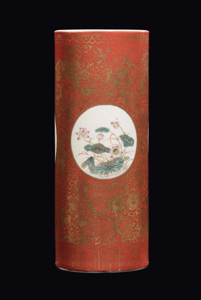 A porcelain vase orange-ground with floral decorations and gold heightening, China, Republic, 20th century