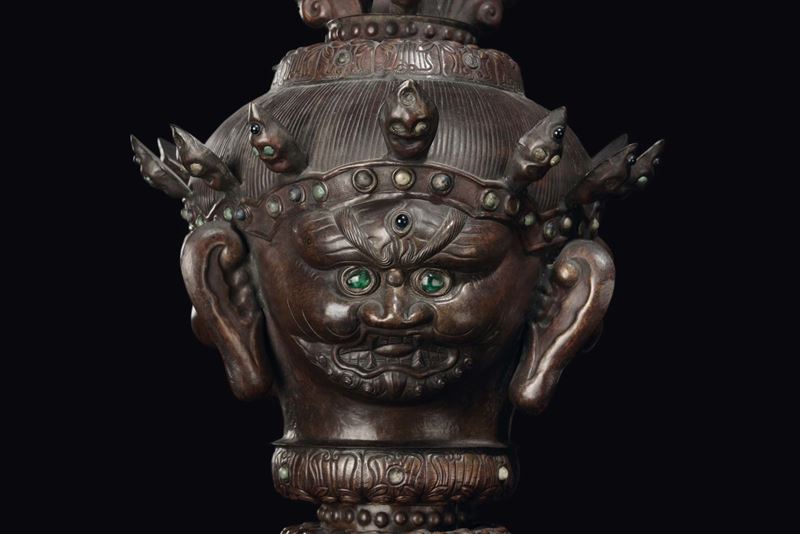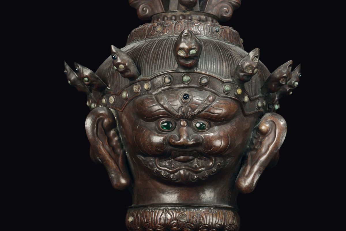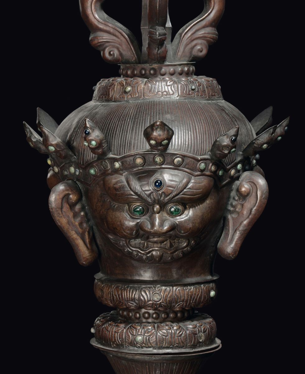 A rare embossed copper “Mahakela head” ceremonial element, Tibet, 18th century