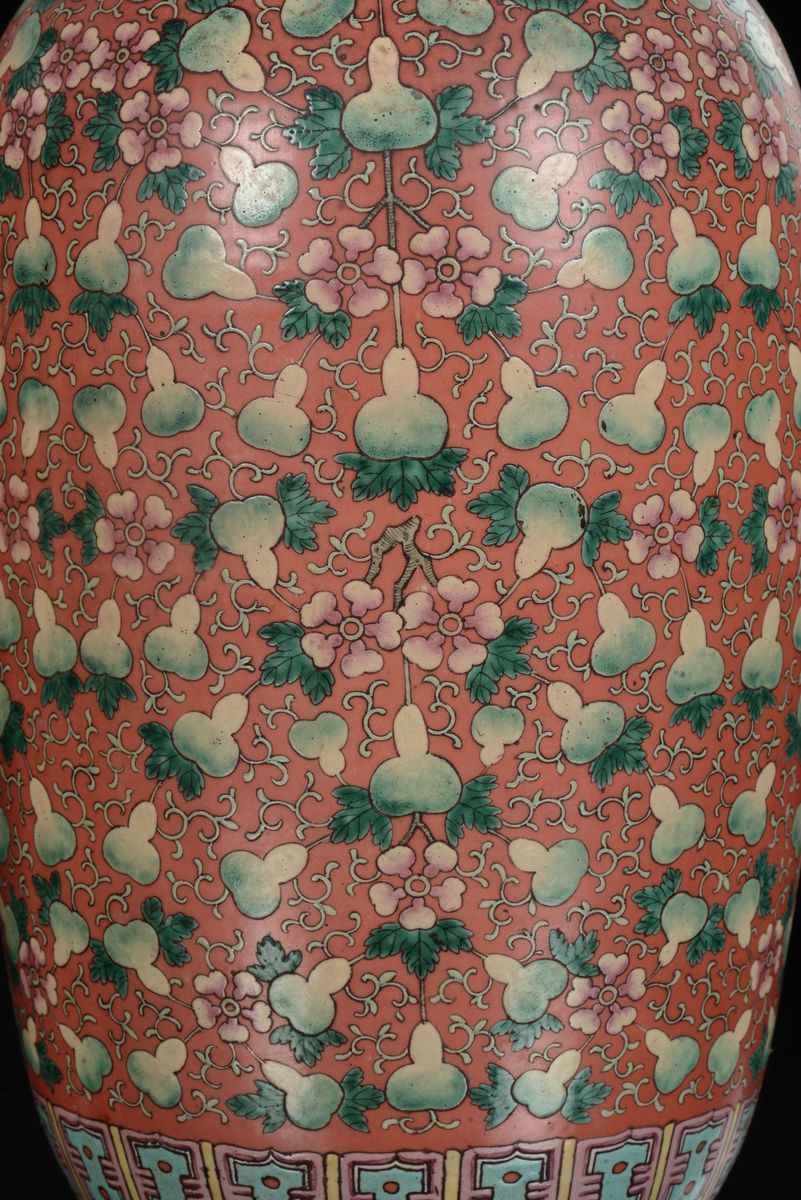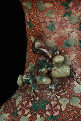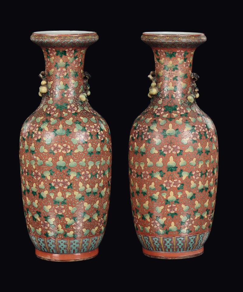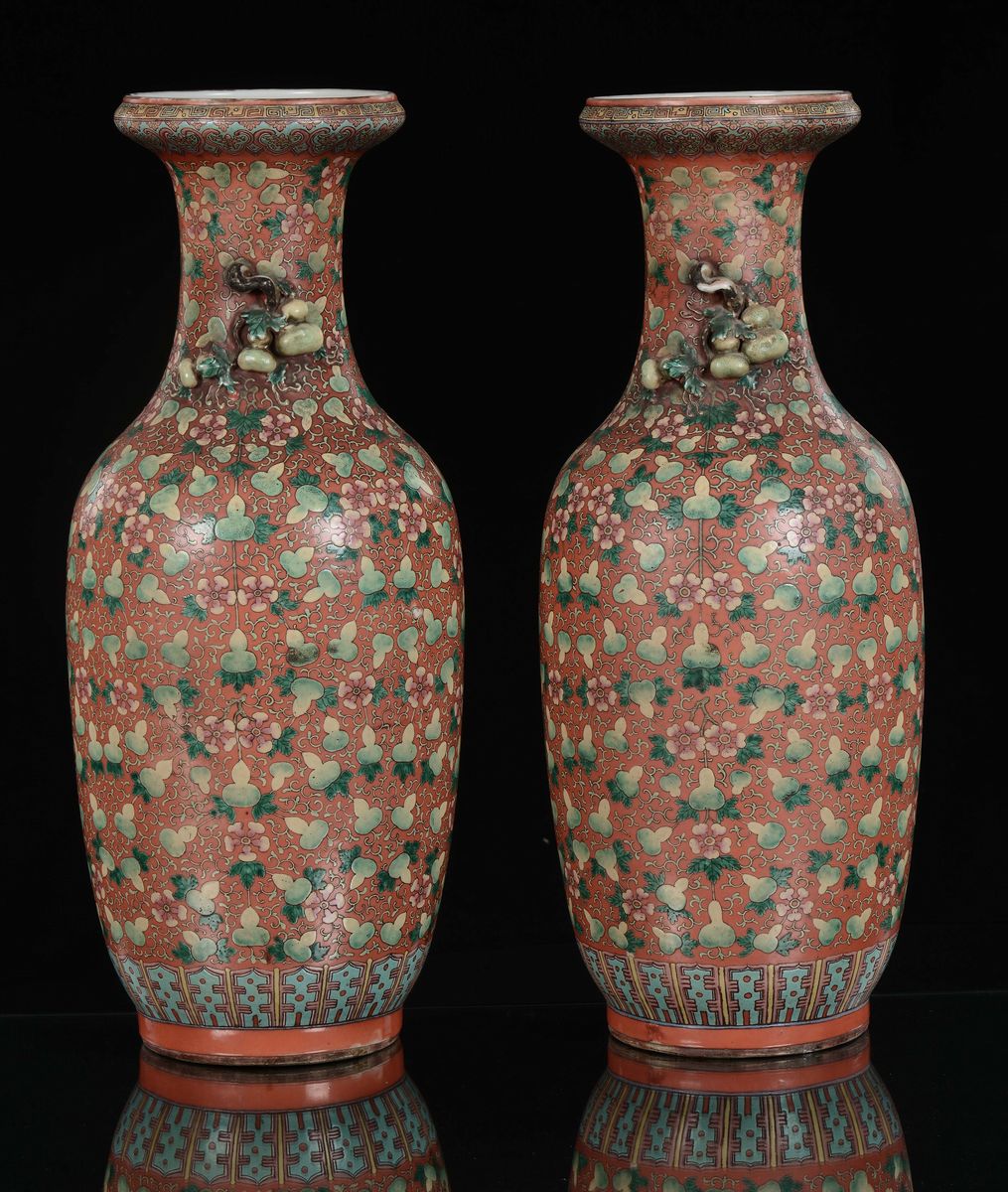 A rare pair of porcelain vases orange-ground with fruit, China, Qing Dynasty, 19th century