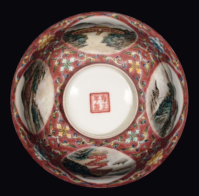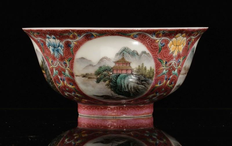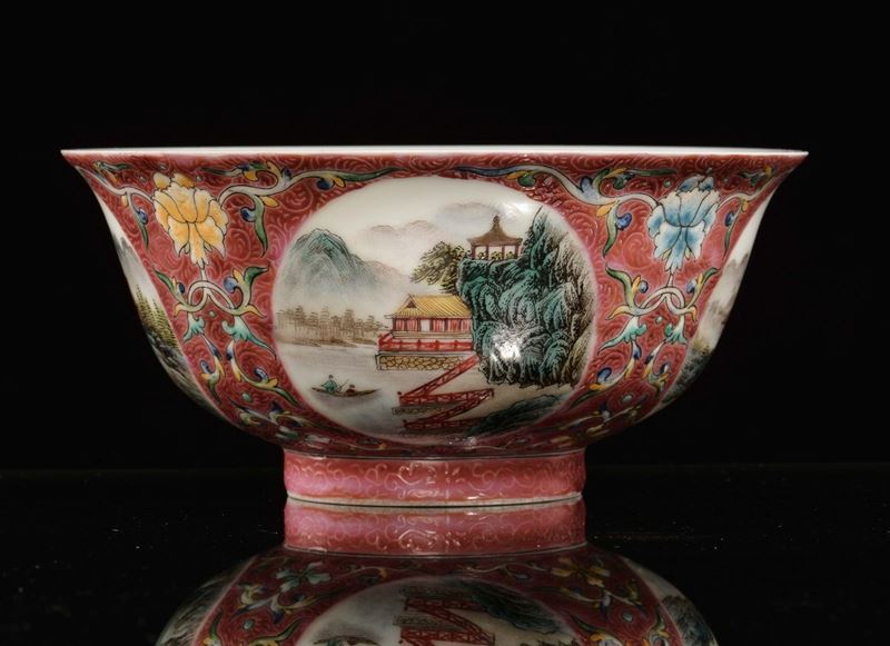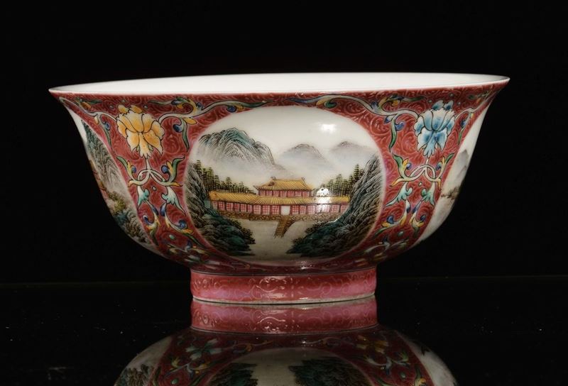 A red porcelain bowl with landscapes, China, early 20th century