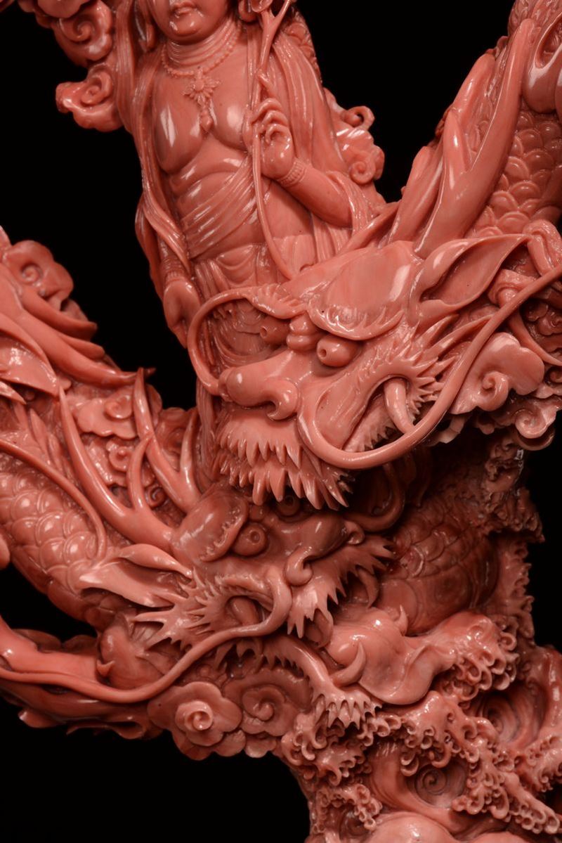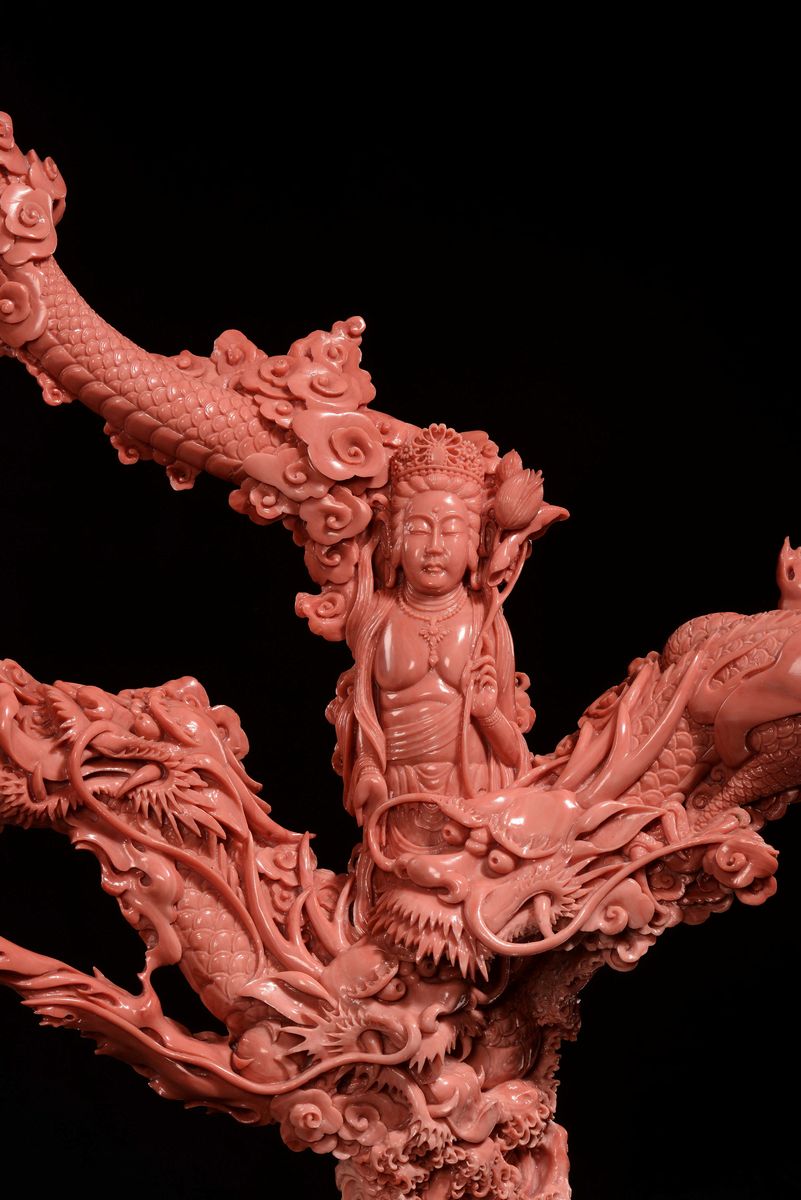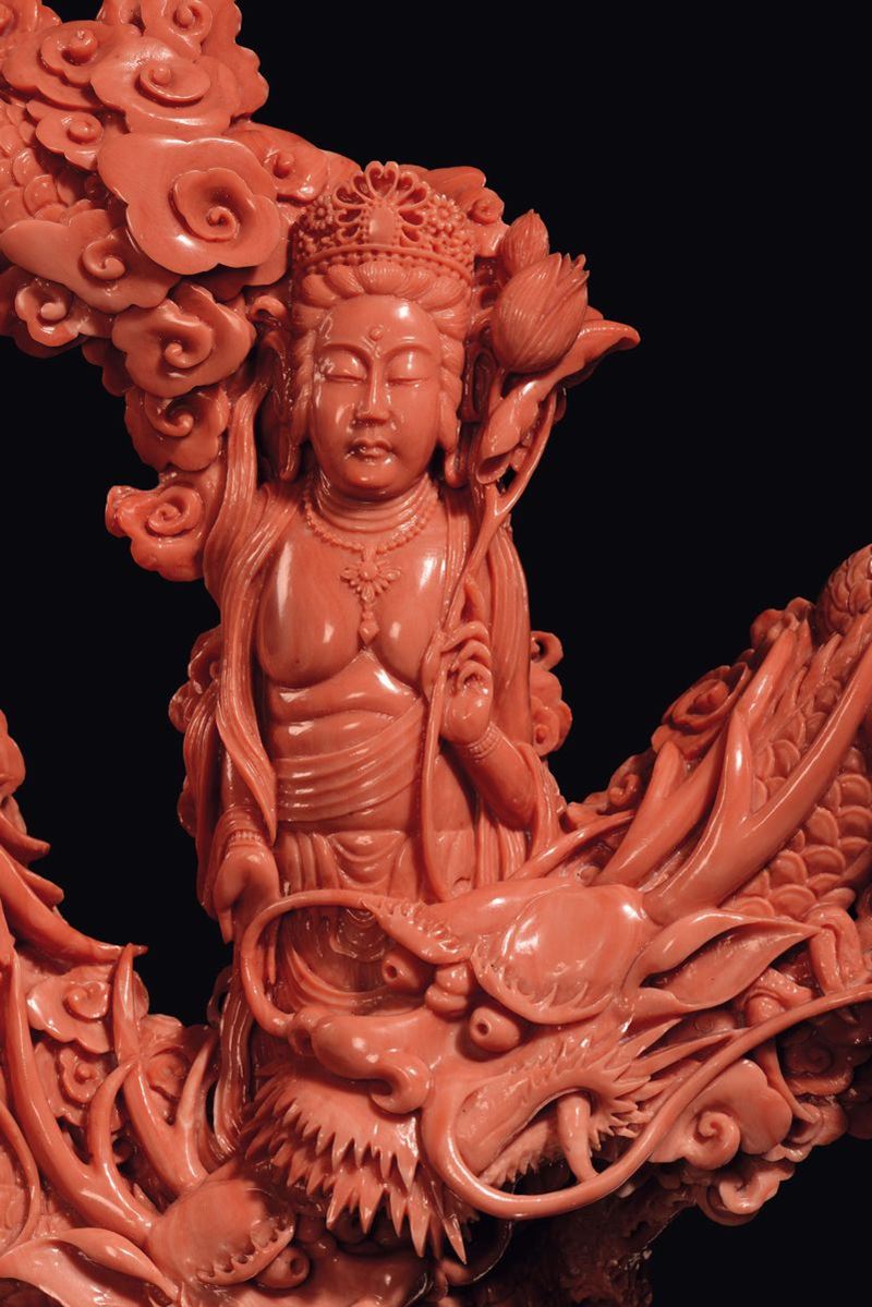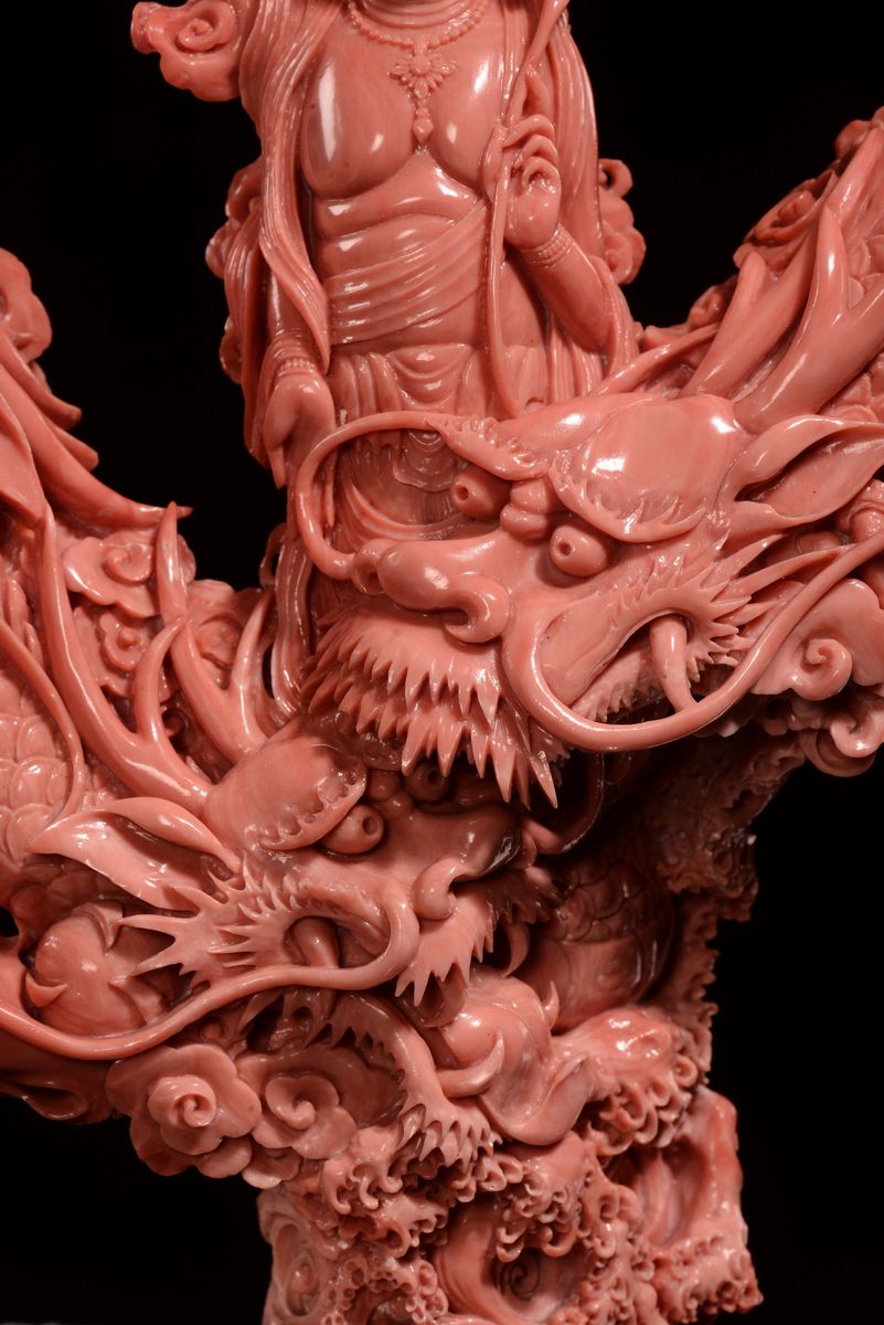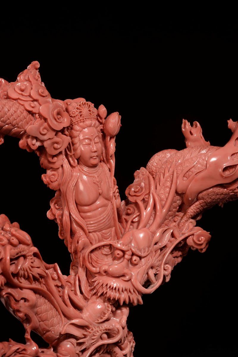 A sculpted coral Guanyin with dragons, China, Qing Dynasty, late 19th century