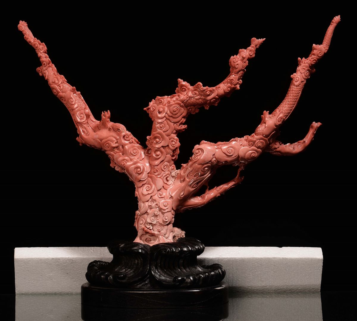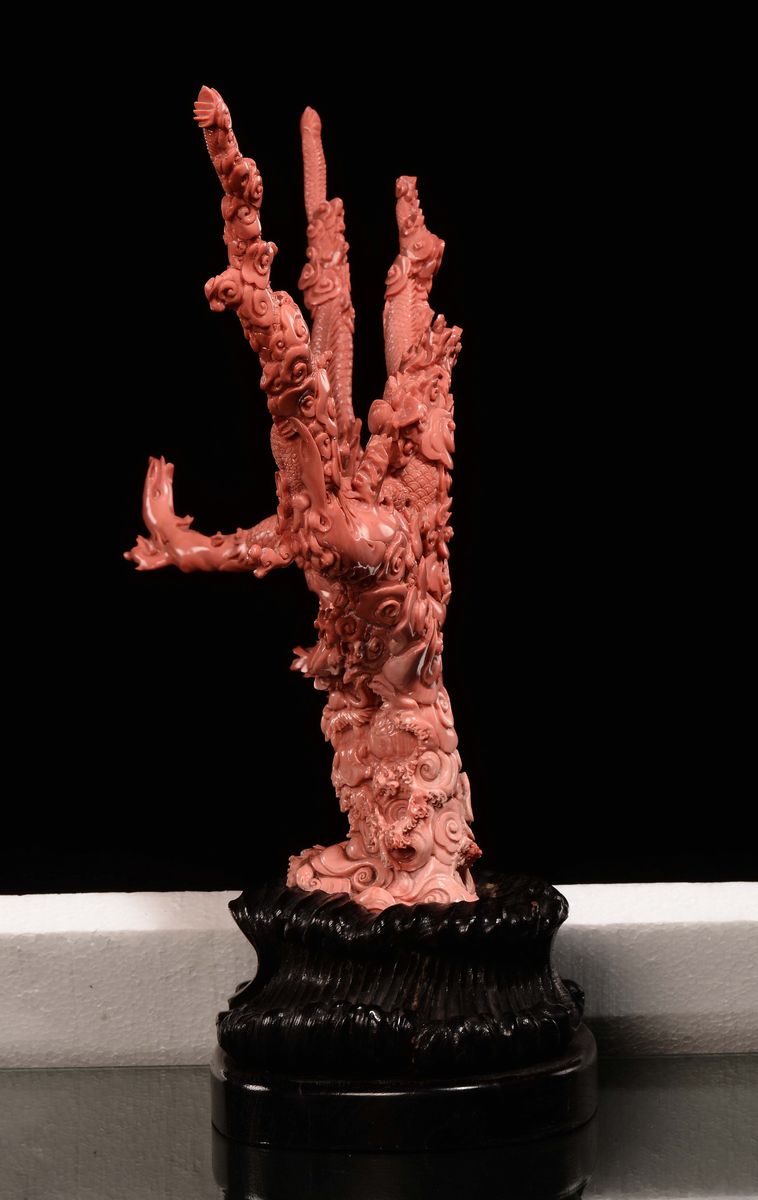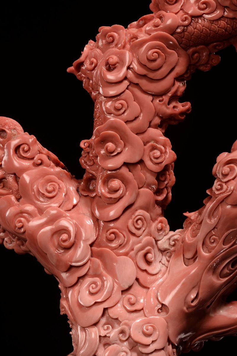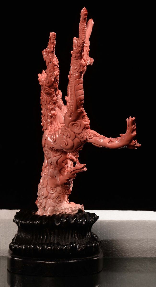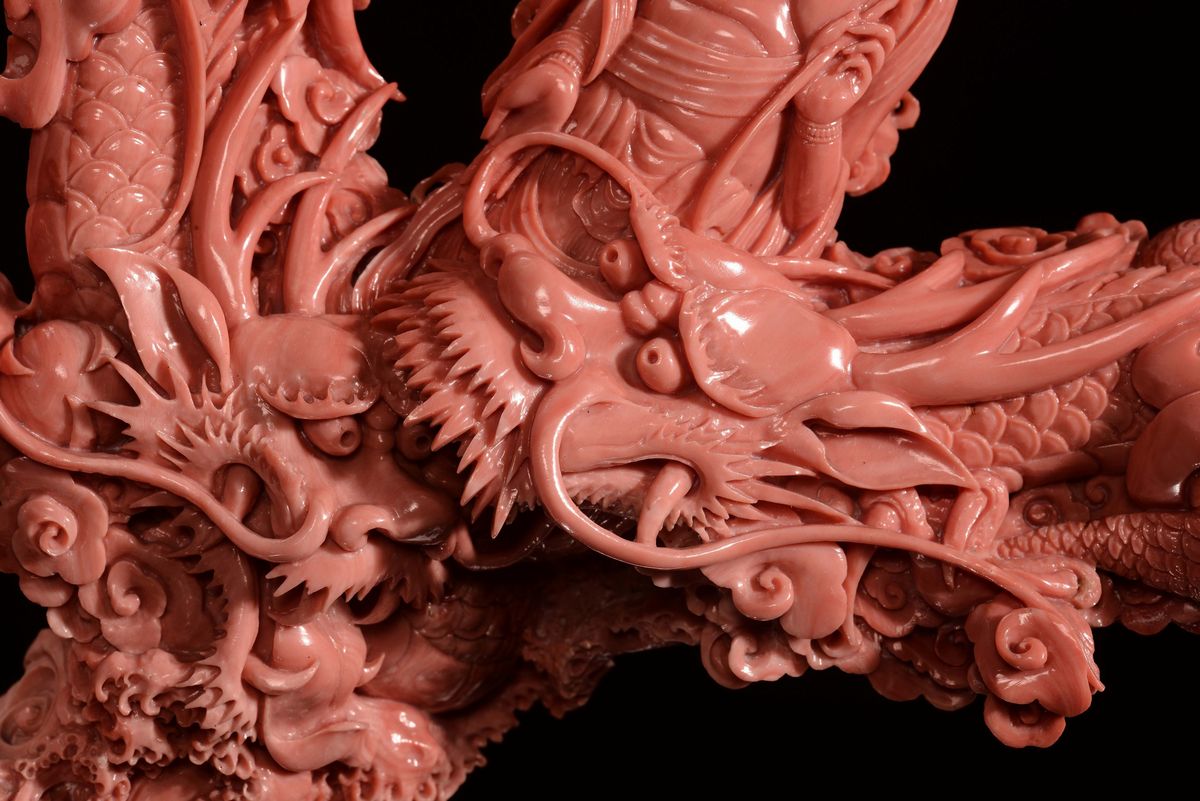 A sculpted coral Guanyin with dragons, China, Qing Dynasty, late 19th century