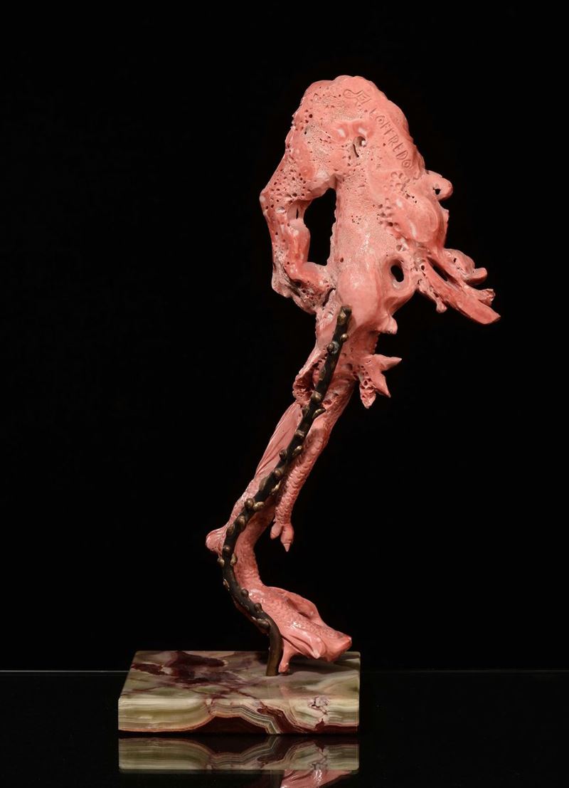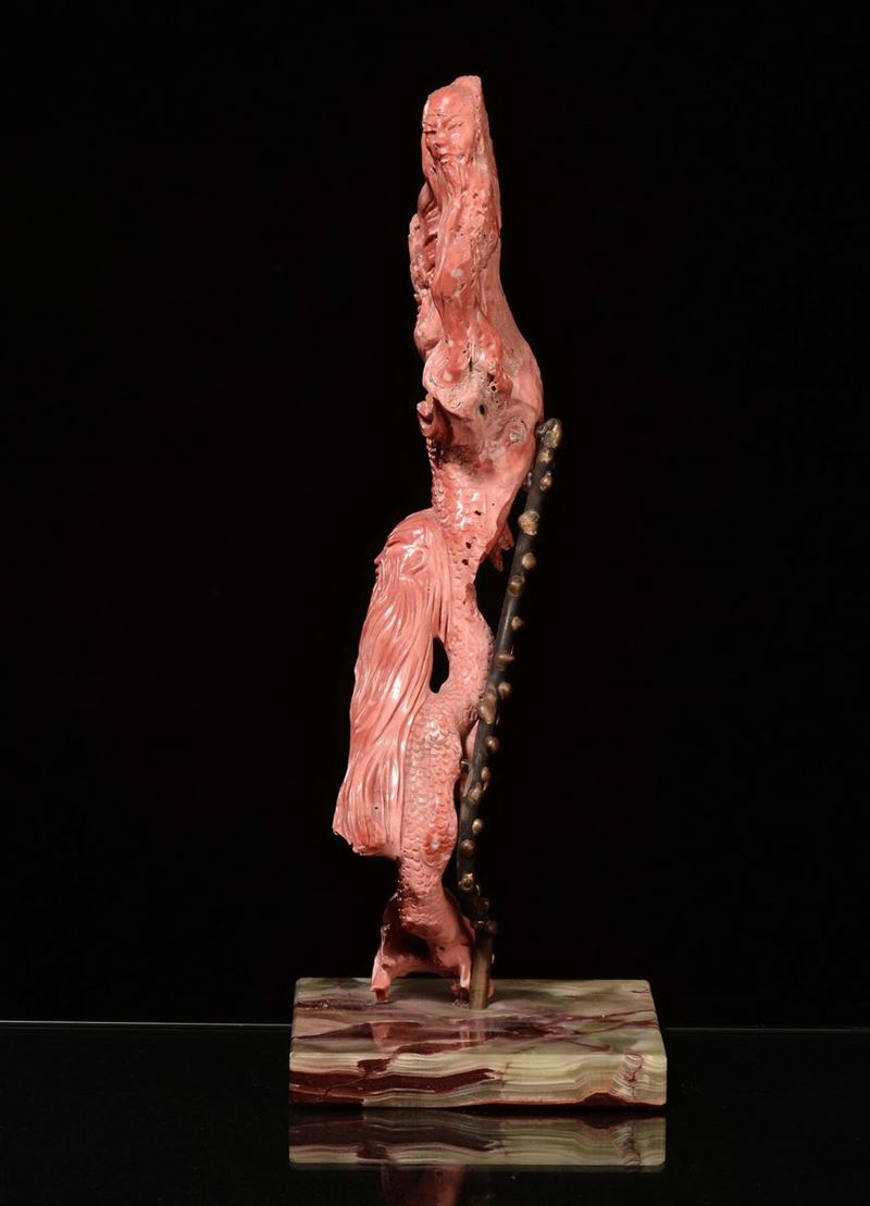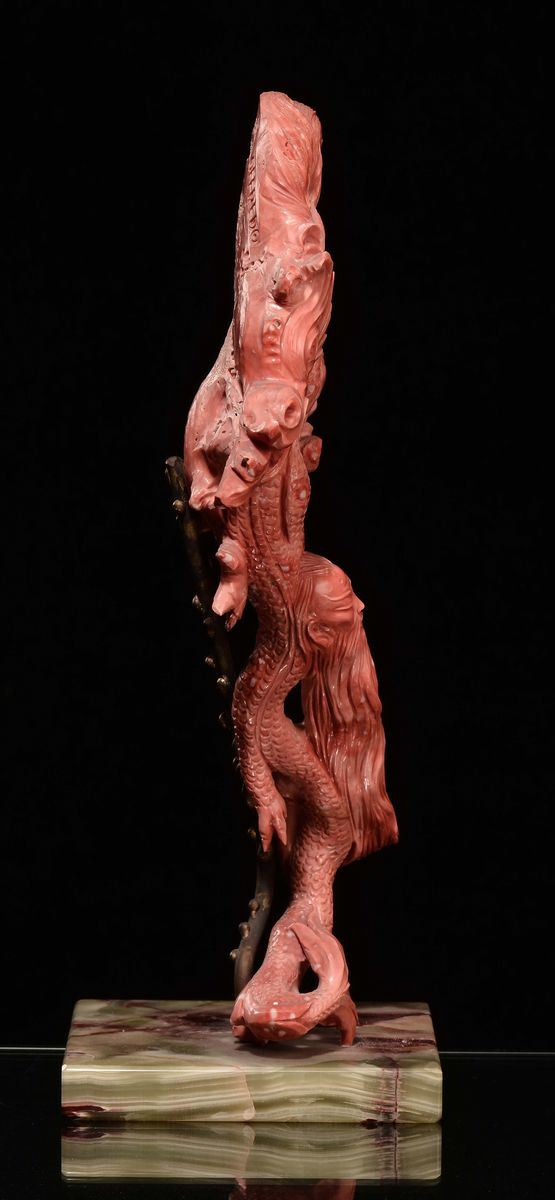 A sculpted “dragon with wise man faces” coral, wooden base, China, early 20th century