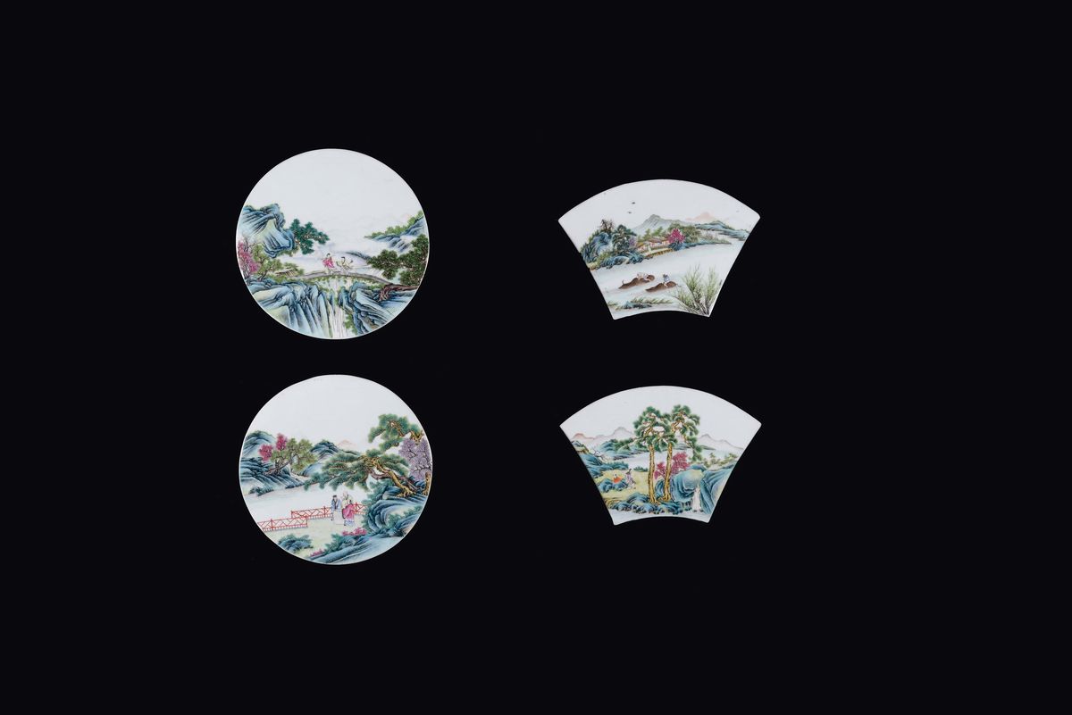 A series of eight polychrome porcelain plaque with landscapes and figures, China, Qing Dynasty, 19th century