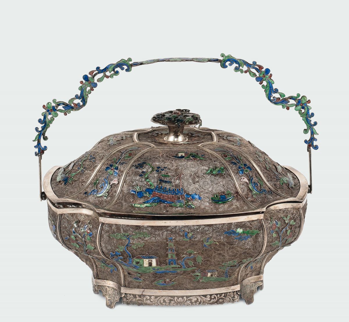 A silver filigree and polychrome glazed basket and cover, China, 19th century