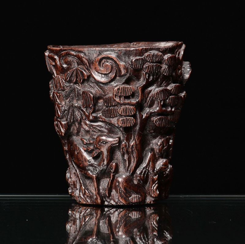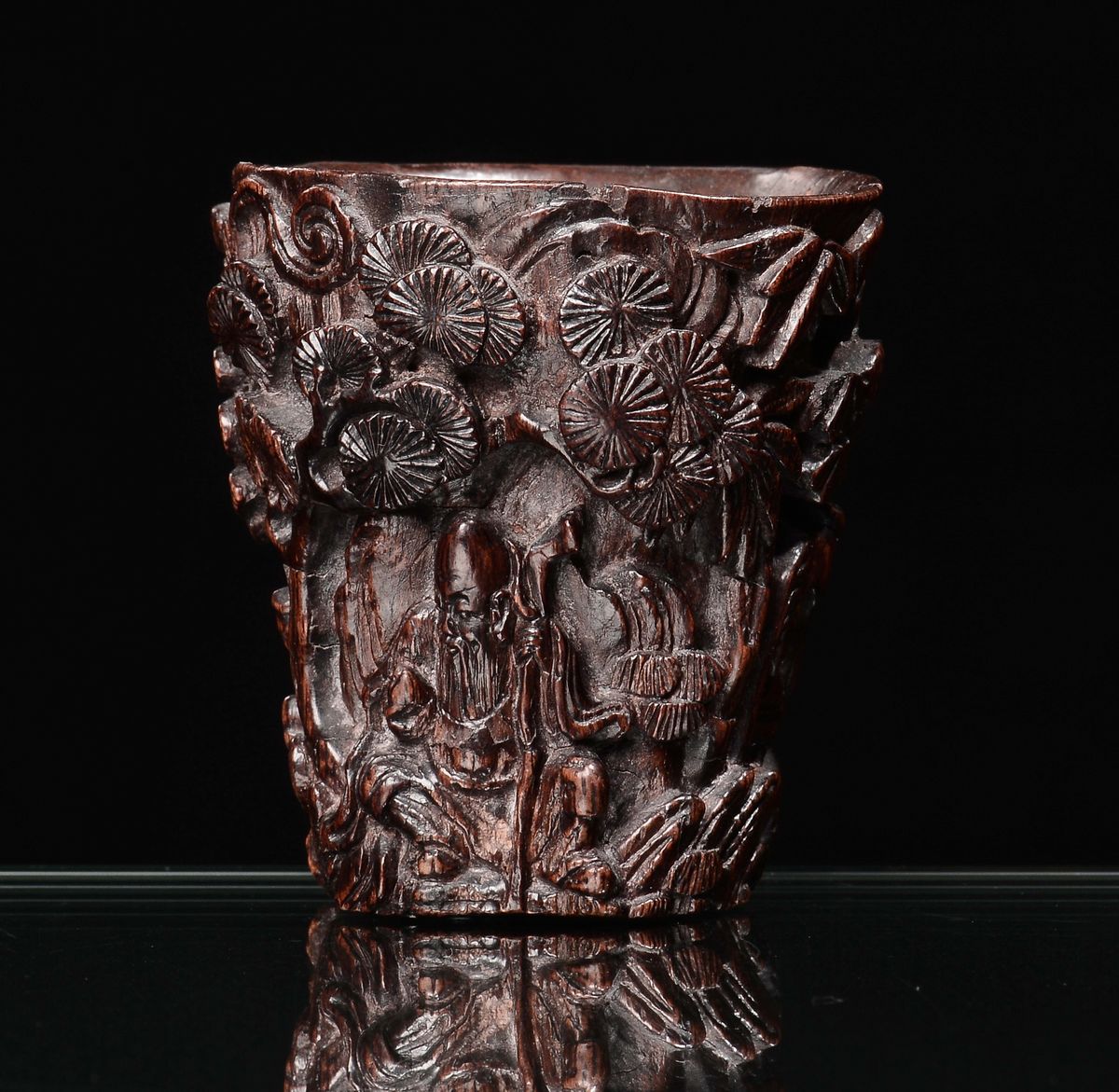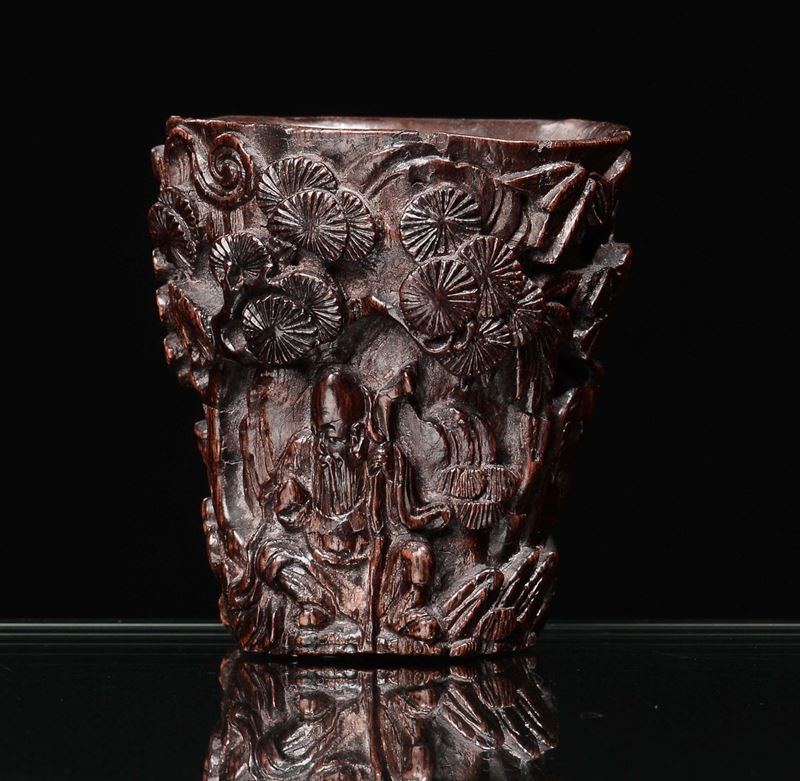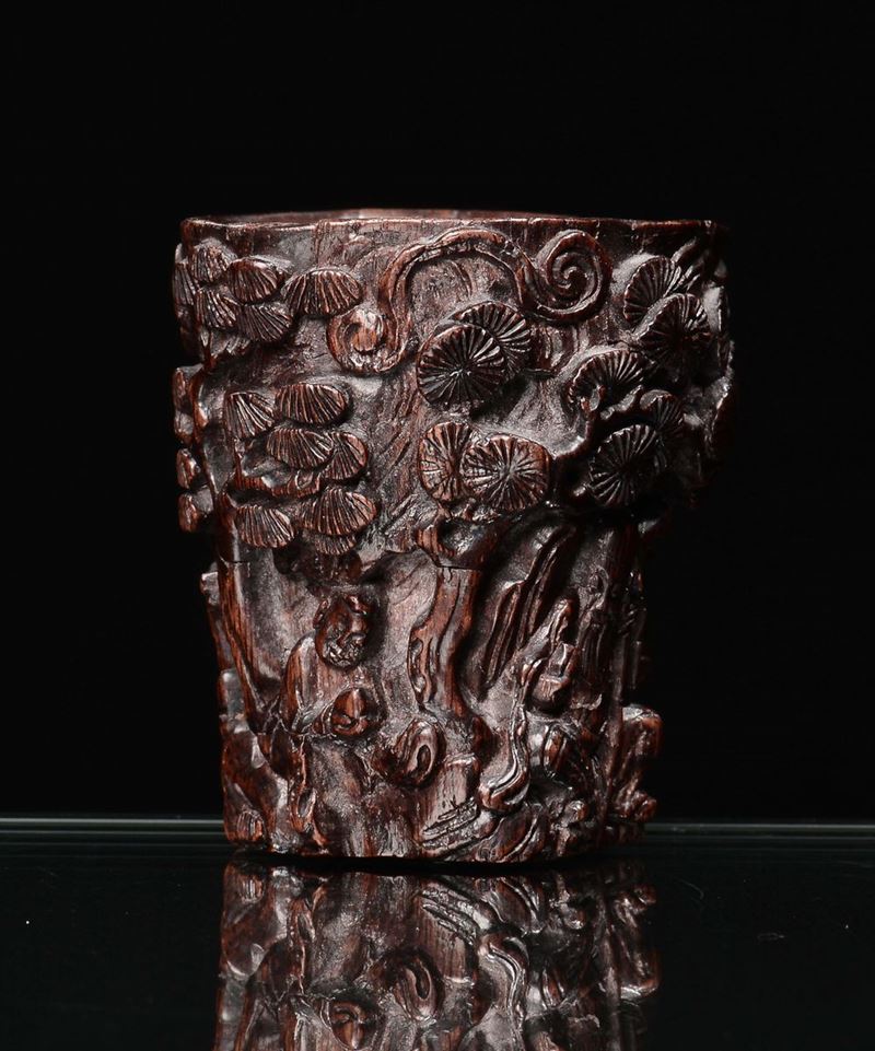 A small carved wood glass with figures and animals, China, Qing Dynasty, 19th century