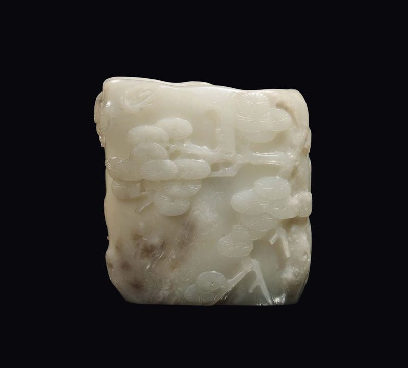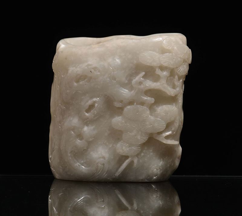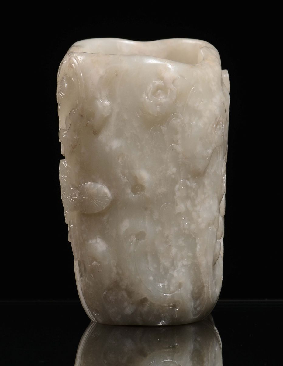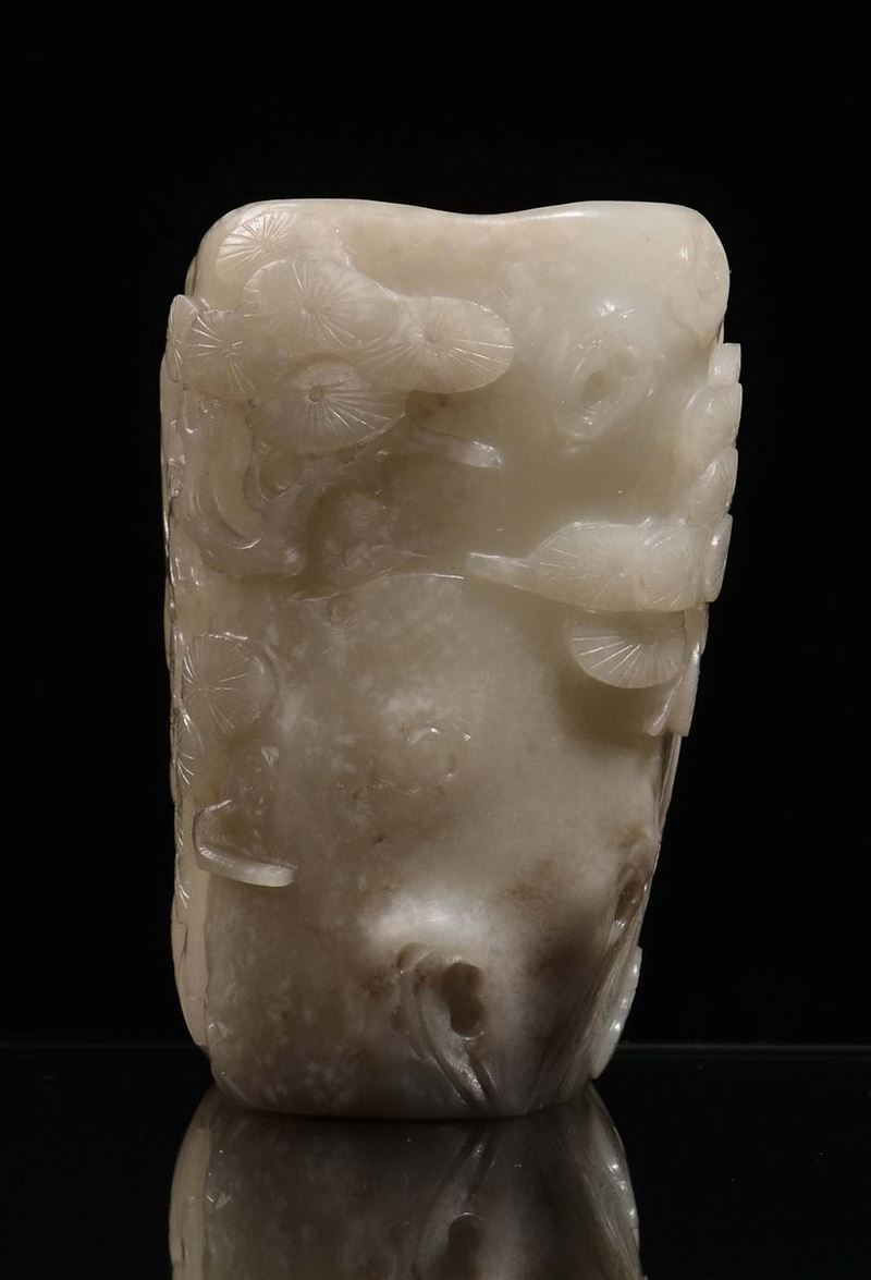 A small Celadon jade vase with carved flowers, China, Qing Dynasty, Qianlong period (1736-1796)