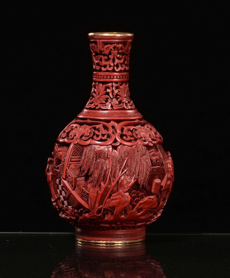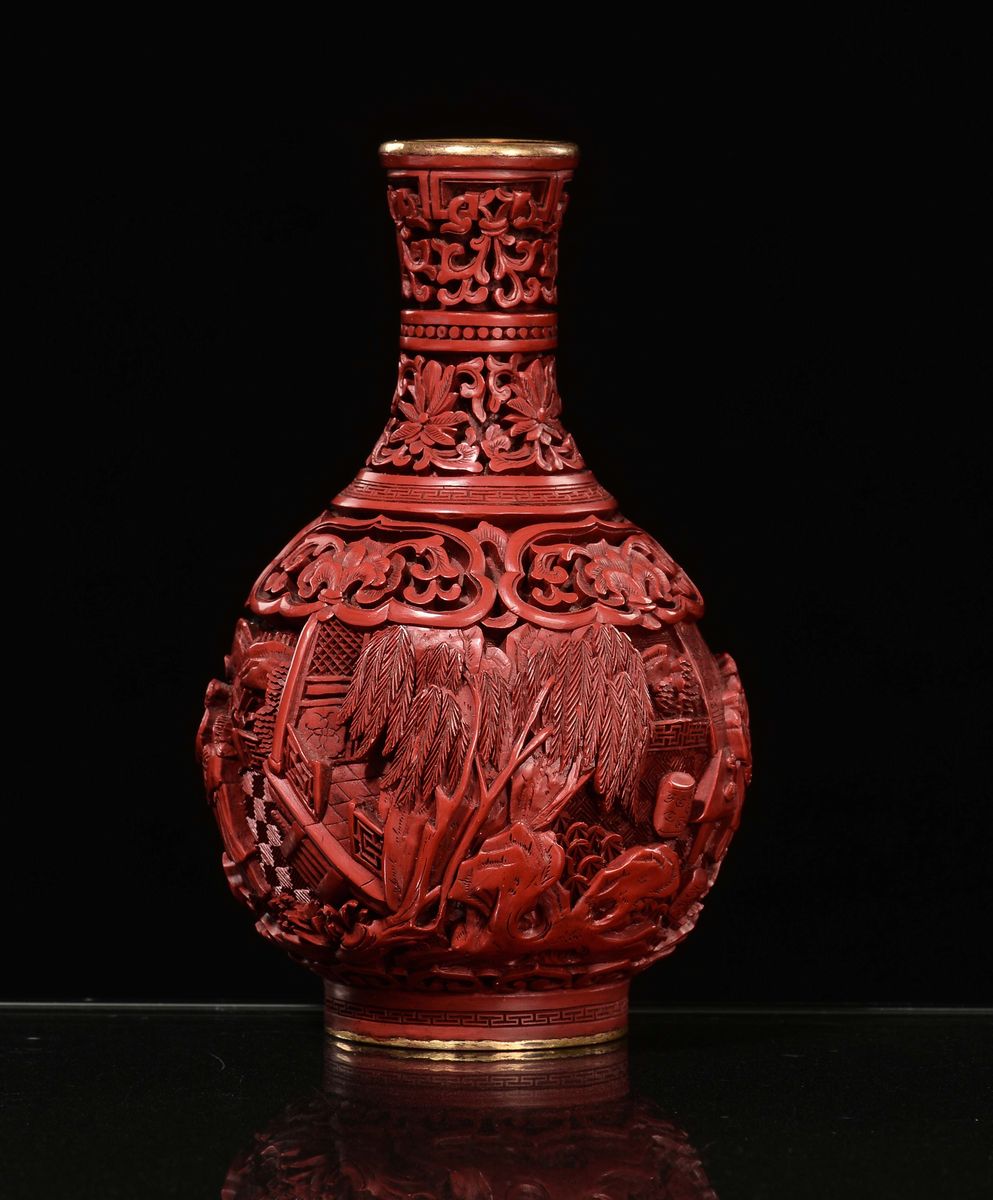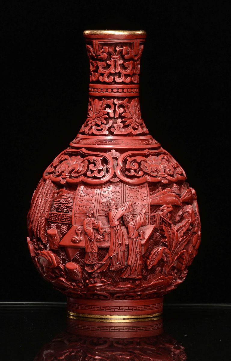A small red carved lacquer vase with court life scenes, China, early 20th century