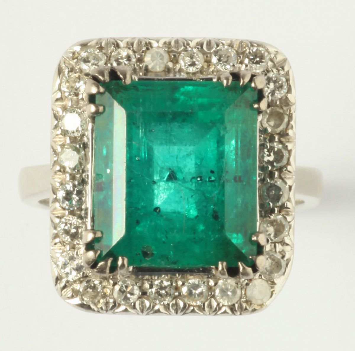 An emerald and diamond ring. The emerald weigh ct 7,15