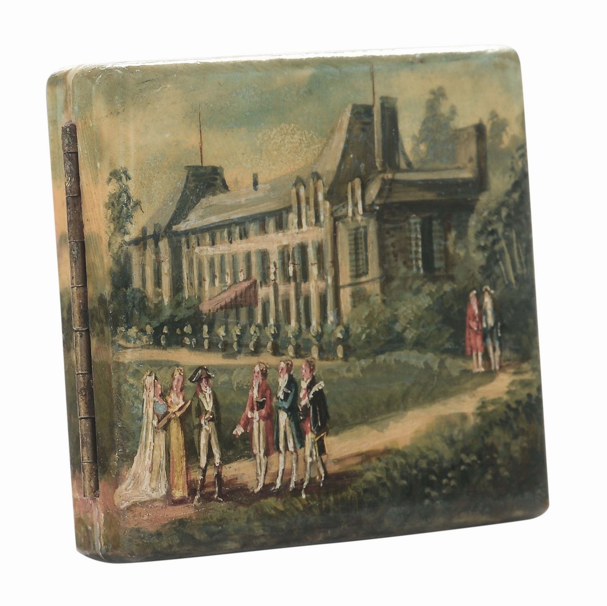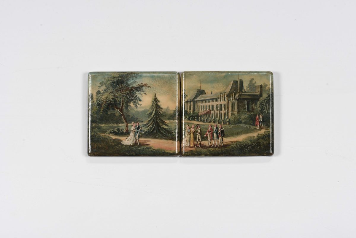 A lacquered picture frame box with landscape and figures and boy and girl miniatures, 19th century