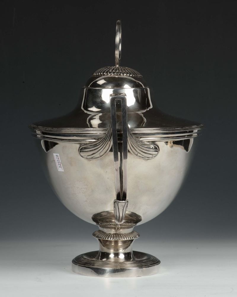 di gusto neoclassico, con manici a decoro floreale, coperchio e piede baccellati, gr. 2100, altezza cm 40x20x30