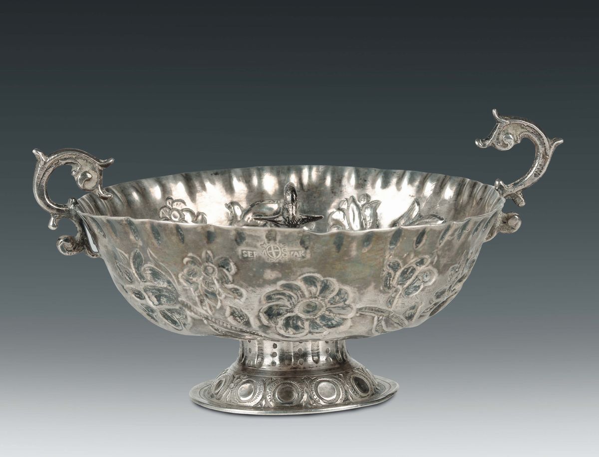 piede circolare e corpo decorato a sbalzo e cesello con motivi floreali, al centro del fondello, su base a rilievo, figura di volatile, ai lati due piccoli manici a ricciolo, gr.185, larghezza cm 16, altezza cm 8