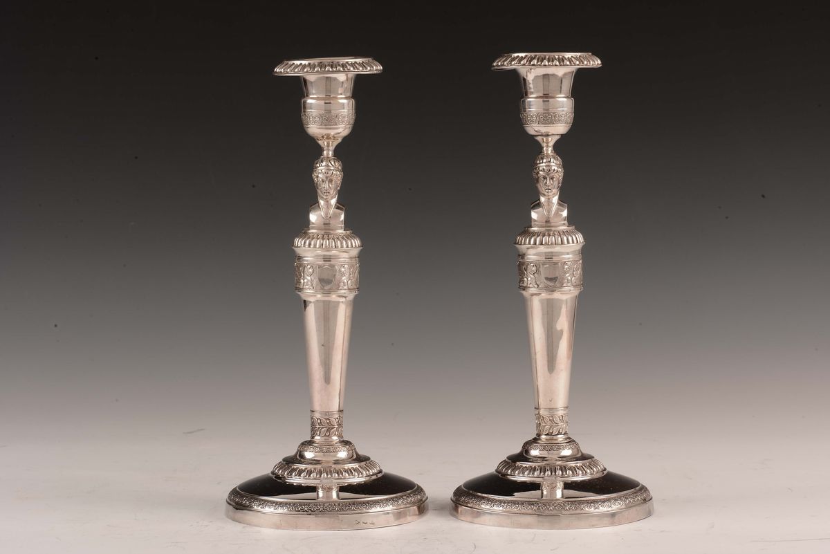 A pair of silver candlesticks with neoclassical decorations, Turin punches used from 1824 to 1872