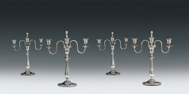 A series of silver two-branched candlesticks with three lights, Emanuele Caber (1812-1850), Milan