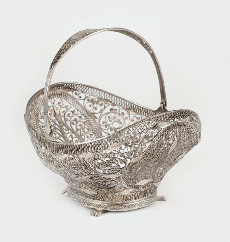 corpo ovale svasato decorato con motivi a volute e geometrici, base ovale poggiante su quattro piedini zoomorfi, cm 16x15