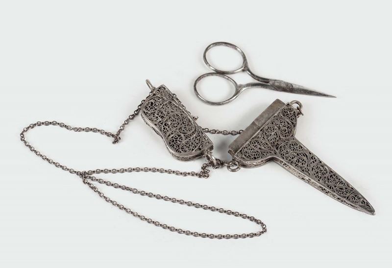A silver filigree box with scissors inside, Genoa 19th century