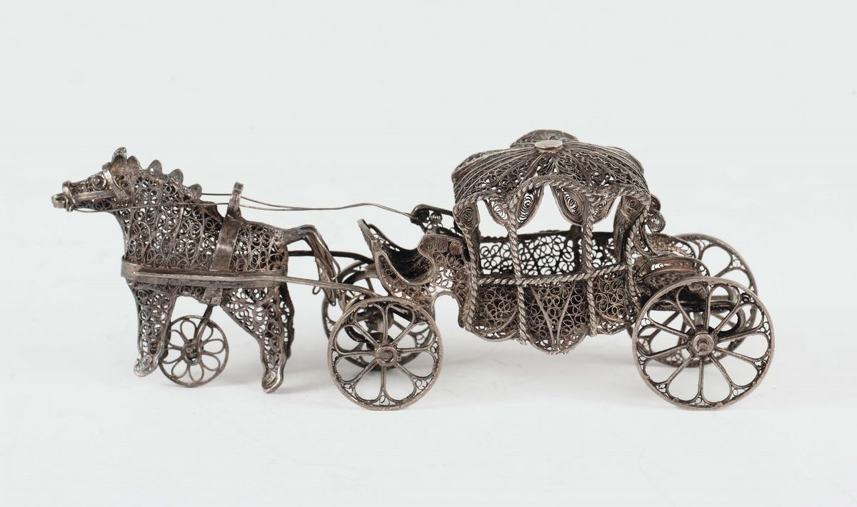 A silver filigree carriage with horse model, Genoa 19th-20th century