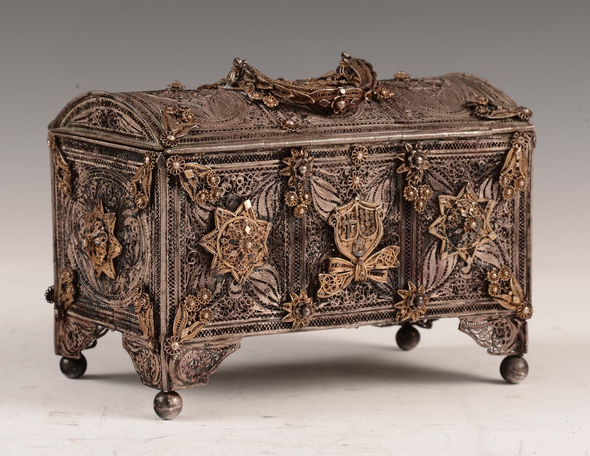 Il cofanetto reca le insegne del Regno dei Serbi, Croati e Sloveni e la data 1922, anno della definitiva caduta dell’Impero Ottomano. In questo stesso anno si celebrano le nozze tra Alessandro I, reggente del regno, e Maria, figlia del re di Romania. Questi riferimenti e l’alta qualità del manufatto indicano che possa essere stato commissionato e realizzato come dono celebrativo dei due importanti eventi.