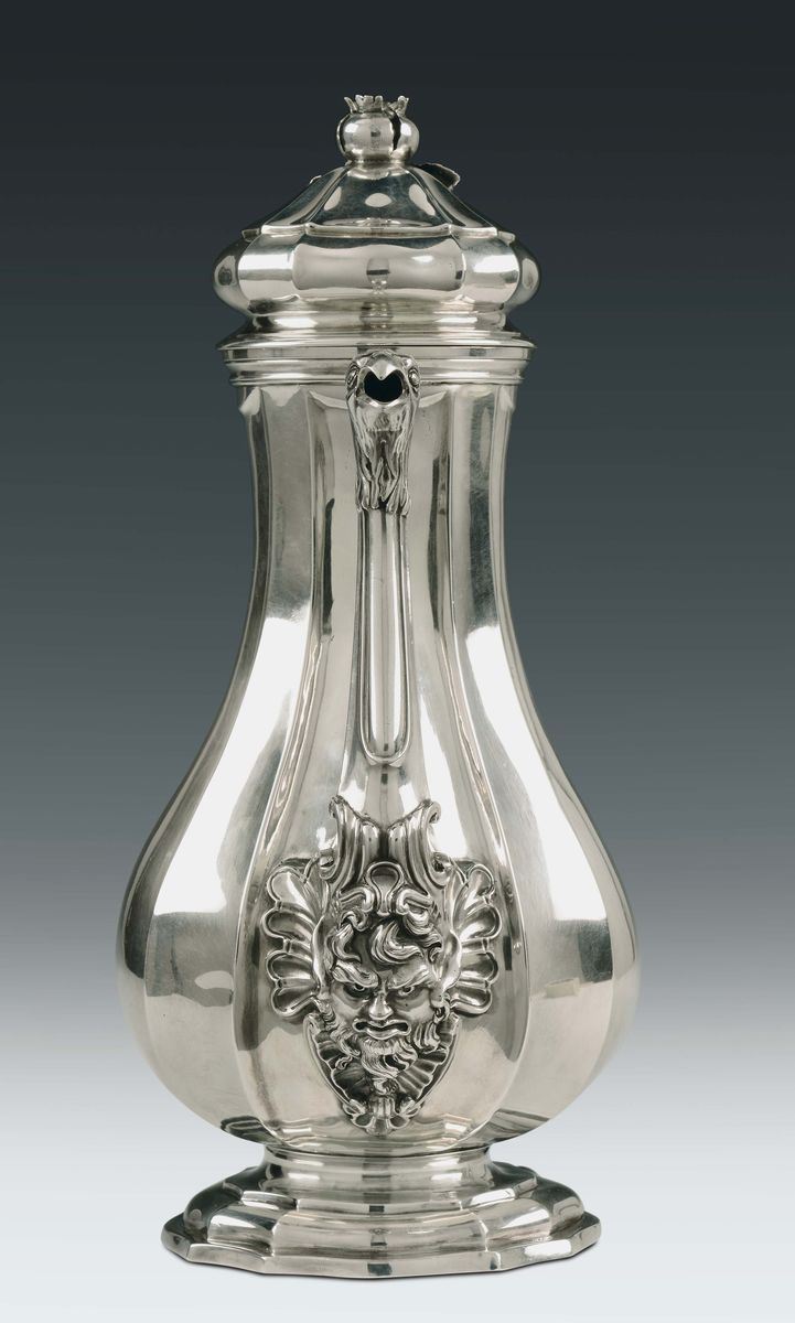 La caffettiera, dalle misurate proporzioni, presenta un corpo piriforme con larghe costolature poggiante su un piede gradinato di forma mistilinea. Attacco del versatoio con importante mascherone incorniciato da motivi a conchiglie e riccioli da cui dipartono leggere nervature terminanti con beccuccio a foggia di testa di rapace. Eleganti attacchi del manico con riserve sagomate a volute ripetute sopra la cerniera dipartono dal coperchio che termina con una presa a forma di melagrana aperta. Perfetto esempio del gusto romano del settecento nella produzione di caffettiere con raffinati particolari che si ritrovano in altri importanti modelli realizzati dalle più celebri botteghe romane. Bibl.: “Argentieri gemmari e orafi d’Italia” di Costantino G.Bulgari, Rima 1969, Parte Terza pag. 248