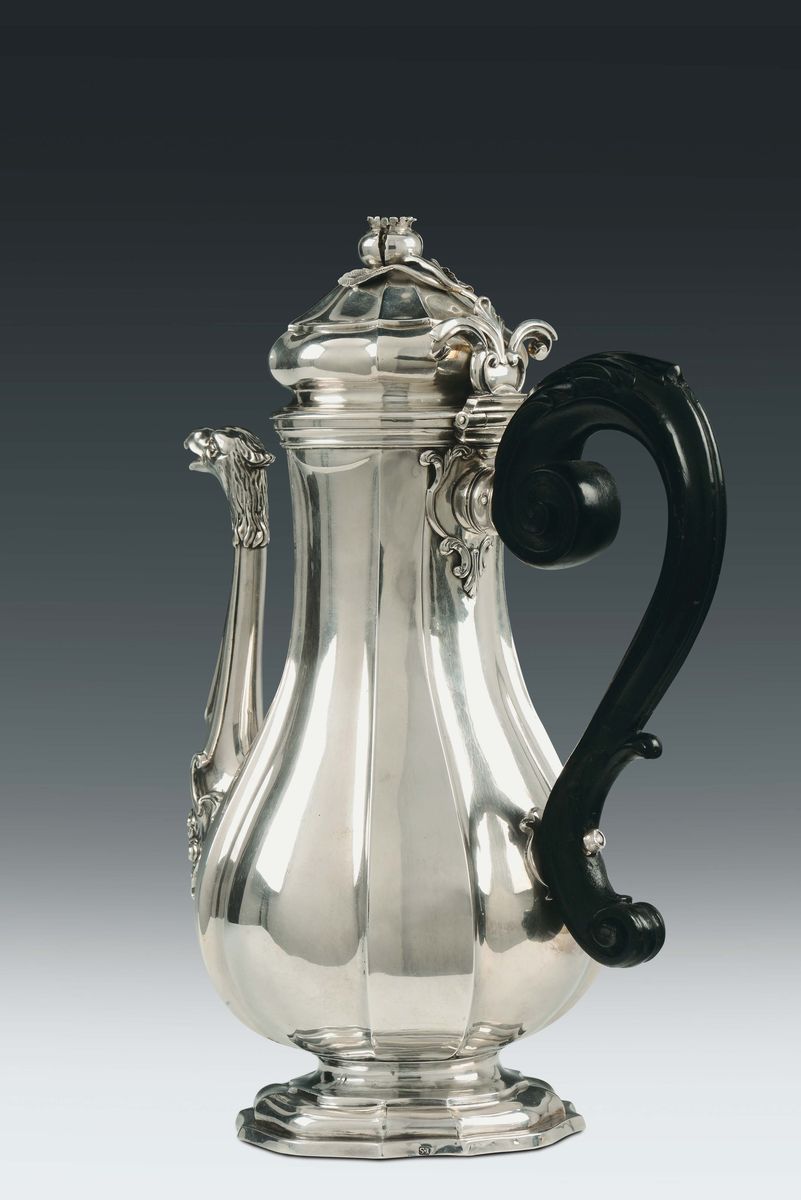 An important molten, embossed and chiselled silver coffeepot, the Papal State, second half 18th century, mark by Simone Tosi, goldsmith and silversmith documented in Urbino around 1760