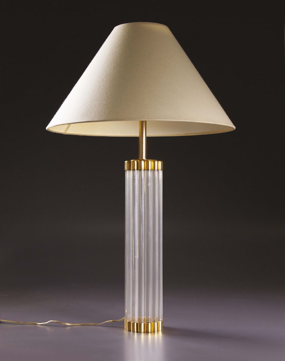 Lampada da tavolo in ottone e plexiglass, paralume in stoffa. Firma incussa.Prod. Crespi, Italia, 1970 ca.cm 45x75