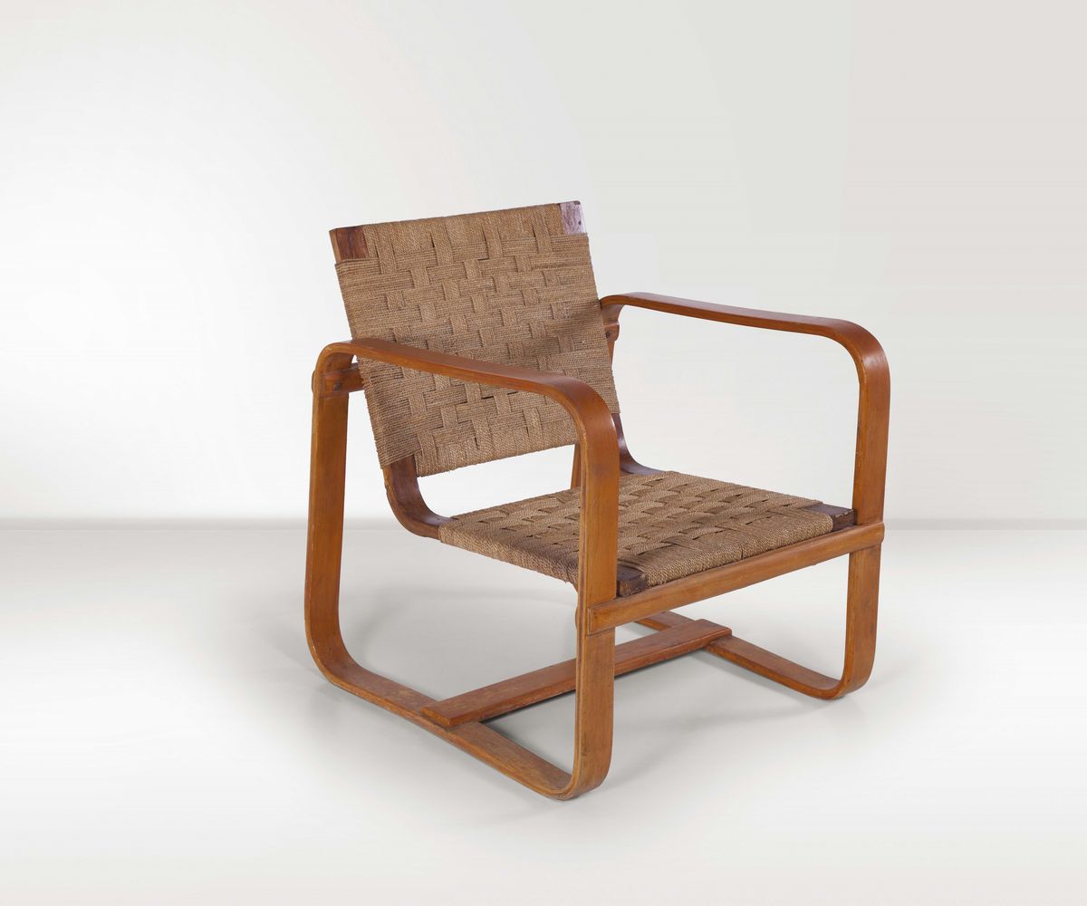 Poltroncina Lamellare in rovere e acerocon sedile e schienale in corda proveniente dall’Universitå Commerciale Luigi Bocconi. Prod. Maggioni, Italia, 1941cm 76x60.5x68