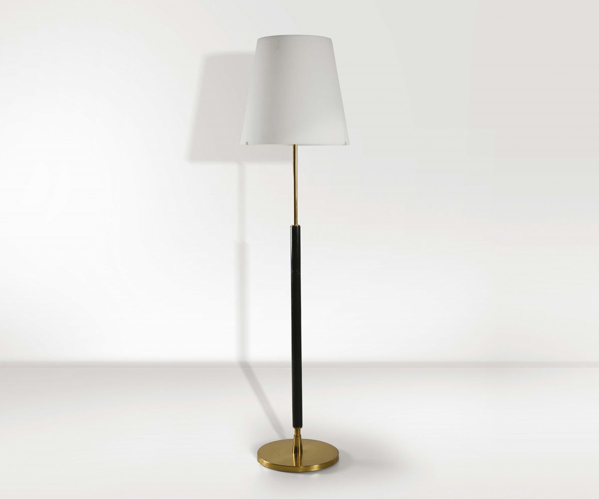 Lampada 2198 da terra in ottone, metallo verniciato e legno ebanizzato. Diffusore in vetro opalino.Prod. Fontana Arte, Italia, 1954cm 50x180