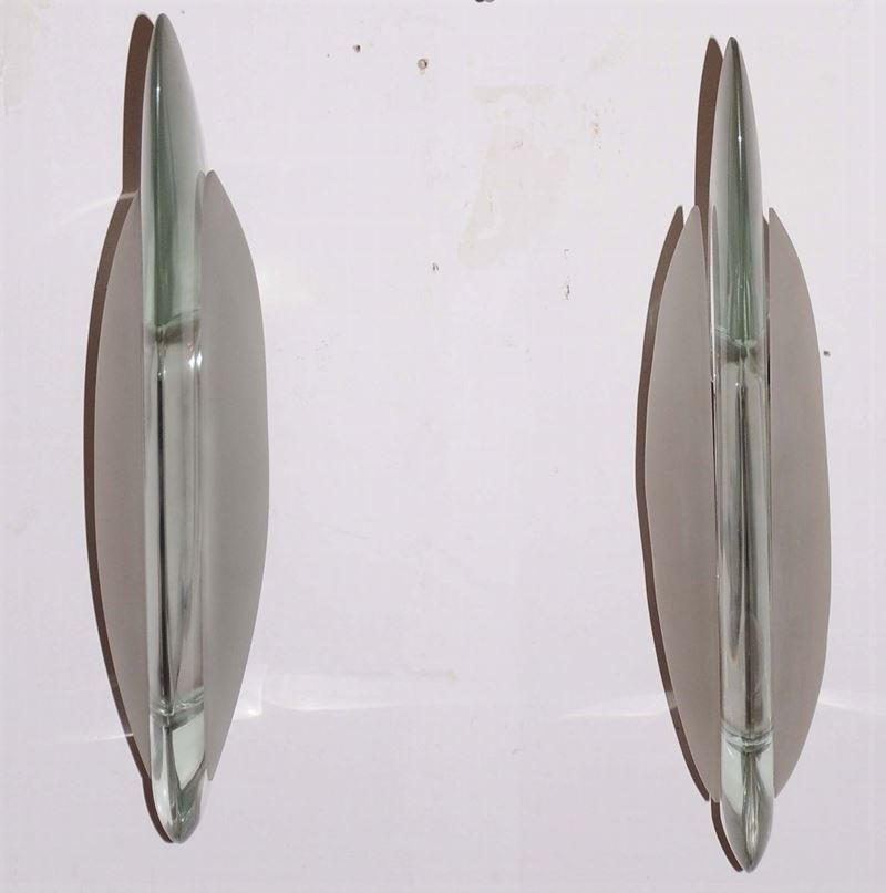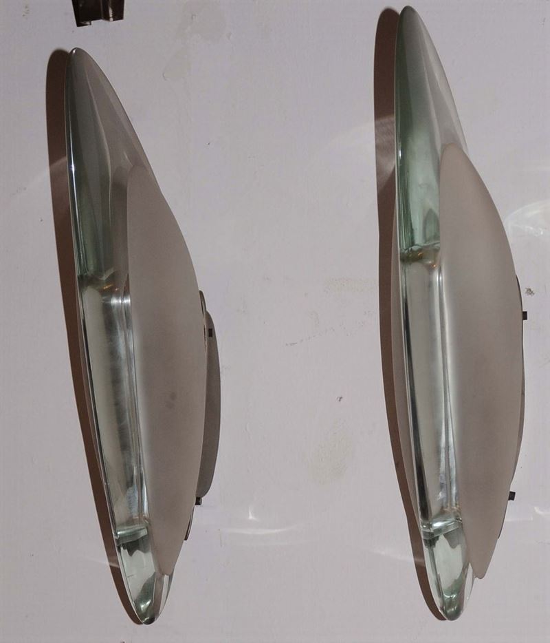 Coppia di appliques modello 1552, corpo in cristallo molato a lente con schermi a vetro satinato e montatura in ottone nichelato.Prod. Fontana Arte, 1955 ca.cm 39x18