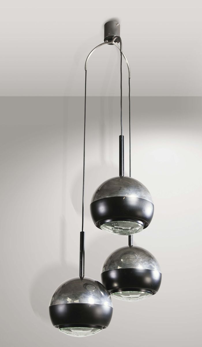 Lampada da sospensione in ottone cromato, metallo verniciato e vetro.Prod. Stilnovo, Italia, 1960 ca.cm 44x130