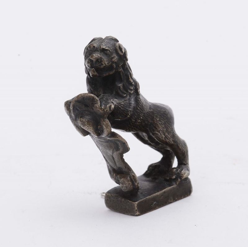 A molten and chiselled bronze lion figure holding a blazon, Venetian or German art, 17th -18th century