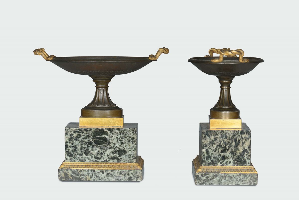 A pair of molten, chiselled, burnished and gilt bronze tazzas with snake-handles, Neoclassic Italian art, 19th century