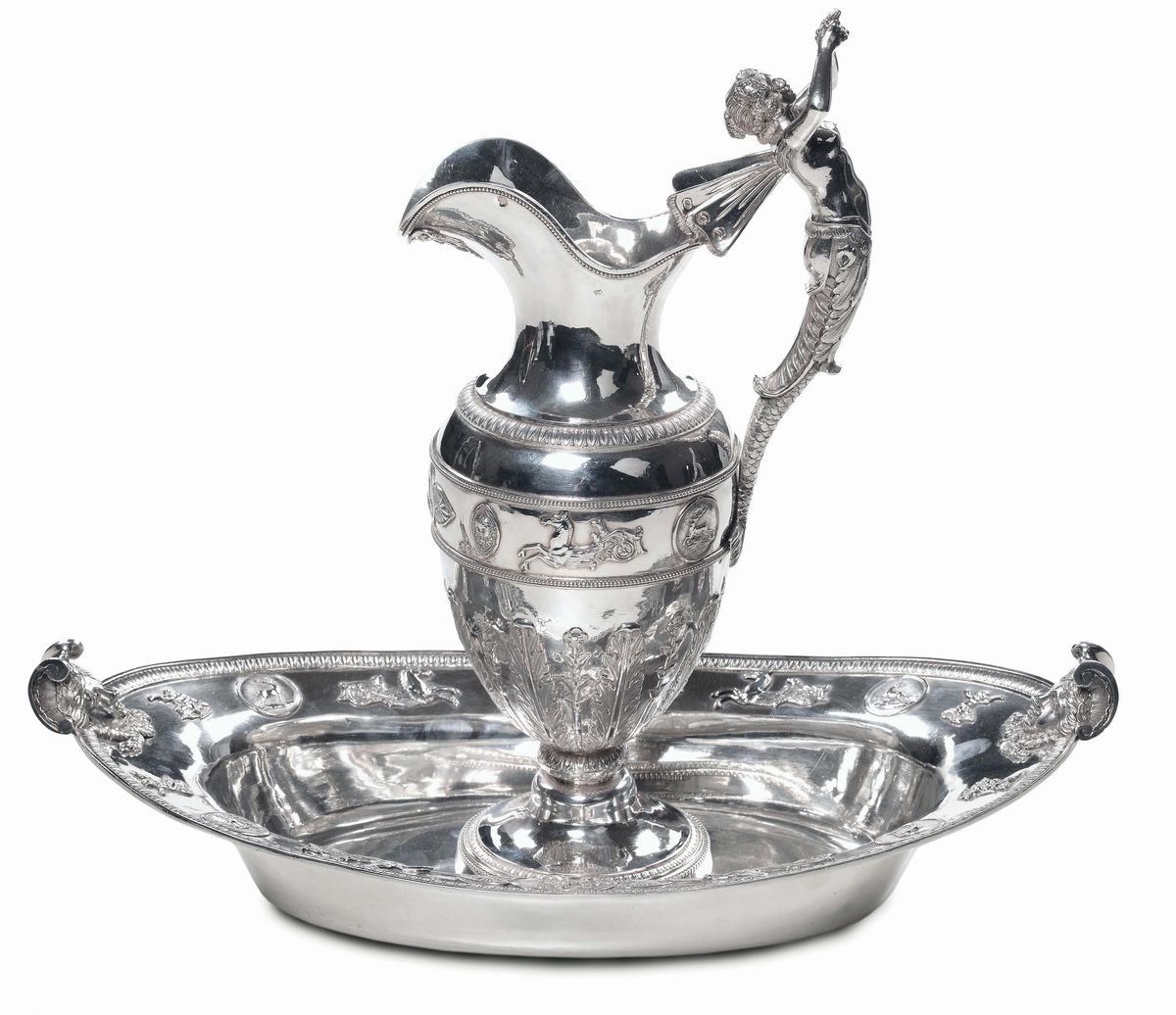Brocca con vassoio ovale in argento fuso, sbalzato e cesellato, Francia XIX-XX secolo