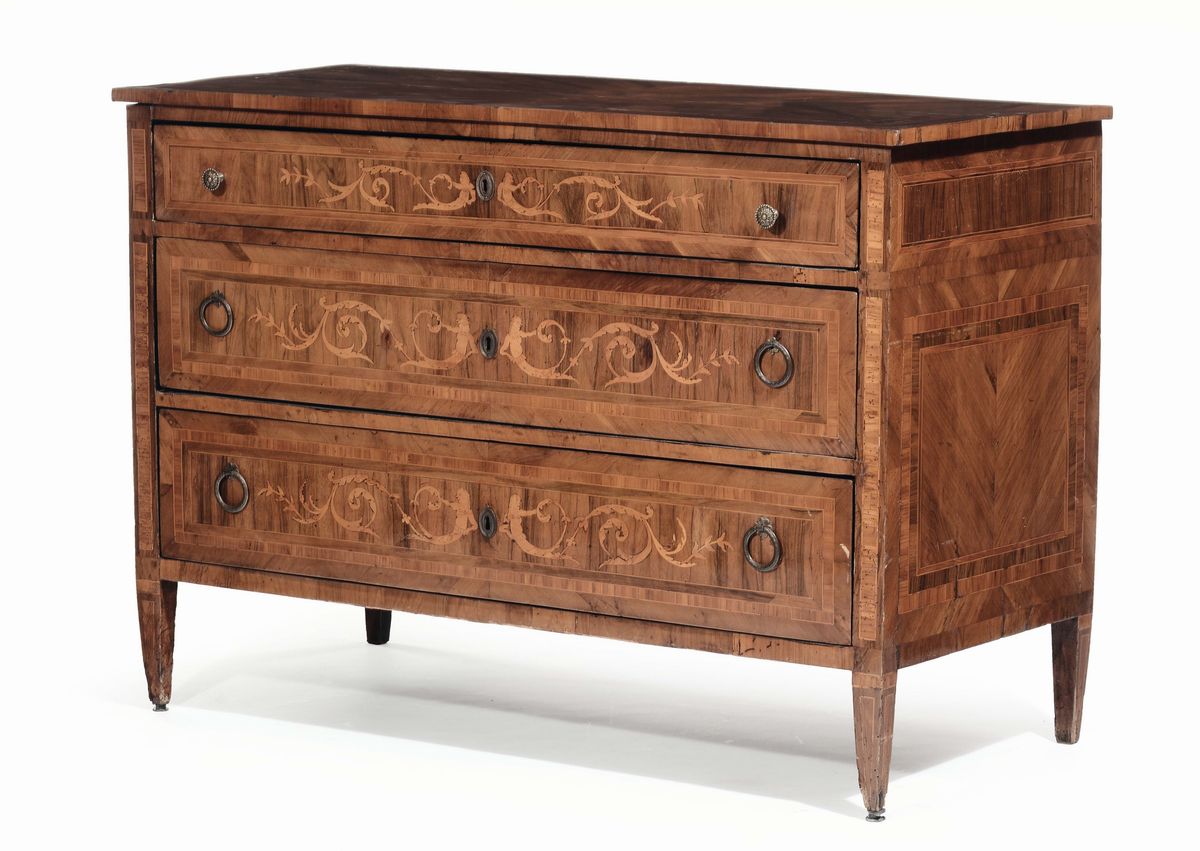 Cassettone in stile Luigi XVI a tre cassetti lastronato ed intarsiato, XIX secolo