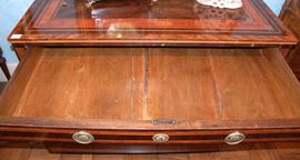 due cassetti a specchio più uno sotto il piano, gambe troncopiramidali, cm 121x58x88