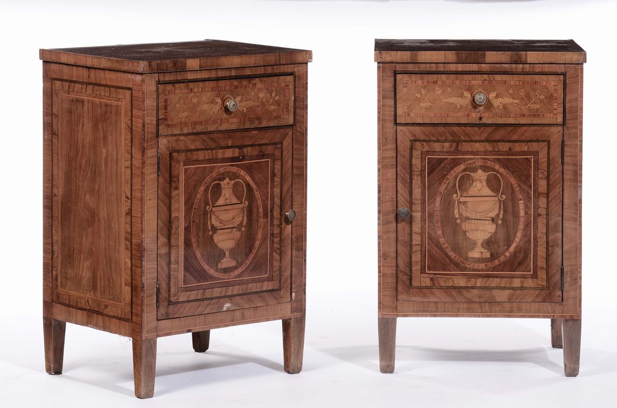Coppia di comodini lastronati ed intarsiati in stile Luigi XVI