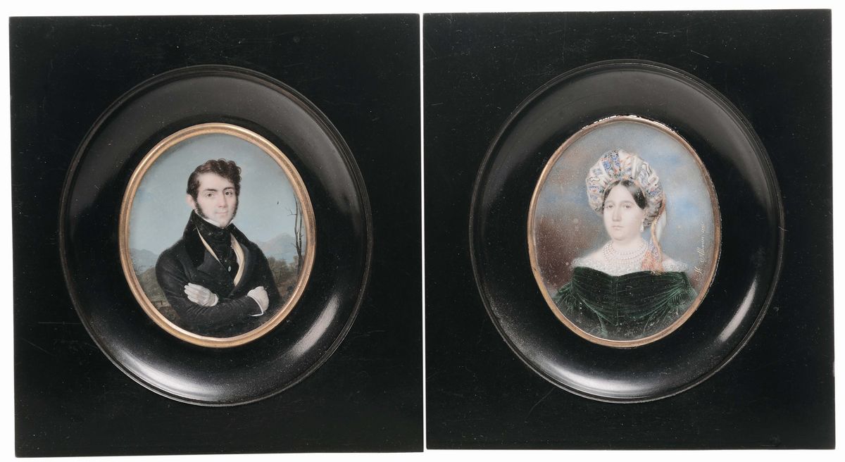 Coppia di miniature con ritratto maschile e femminile, XIX secolo