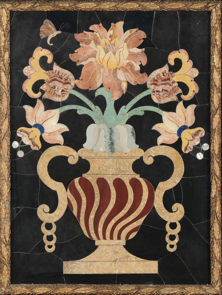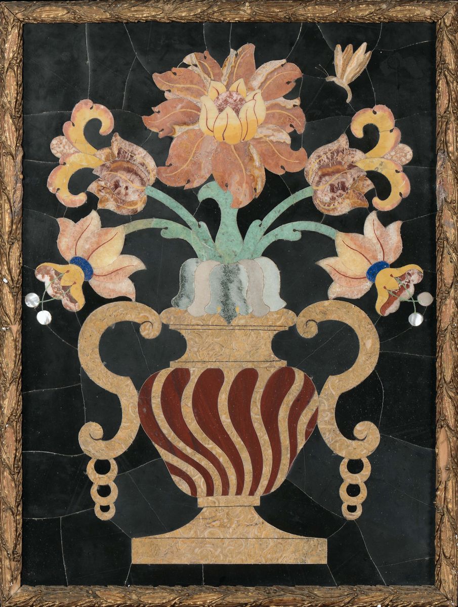Coppia di pannelli a commesso di marmi colorati raffiguranti vaso con fiori, XX secolo