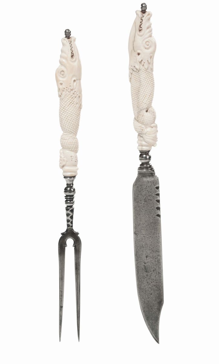 Coppia di posate con manici in avorio a guisa di delfino, probabile XVIII secolo